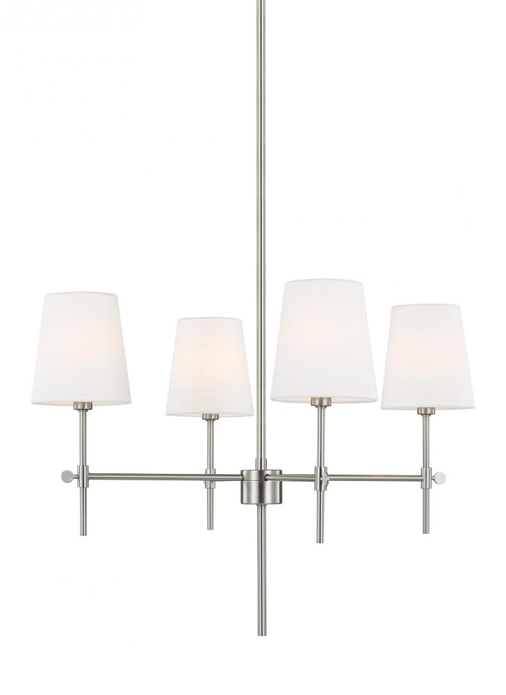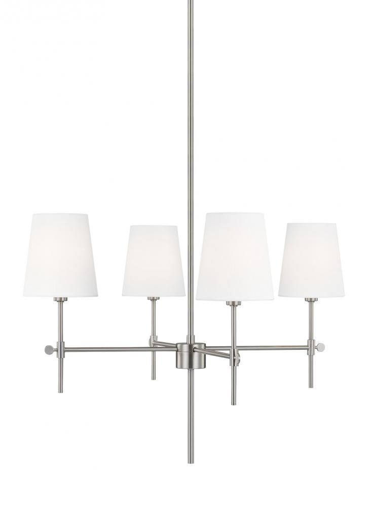 The Baker four light single tier chandelier in Midnight Black introduces transitional-inspired design to your living room or dining room. It's made from metal and features a round body with arms that support sleek torchieres. Round finials and faux candle holders complete the look with a hint of traditional appeal. White linen fabric shades cap the design and diffuse the light from 60W candle bulbs (not included). Available in three finishes