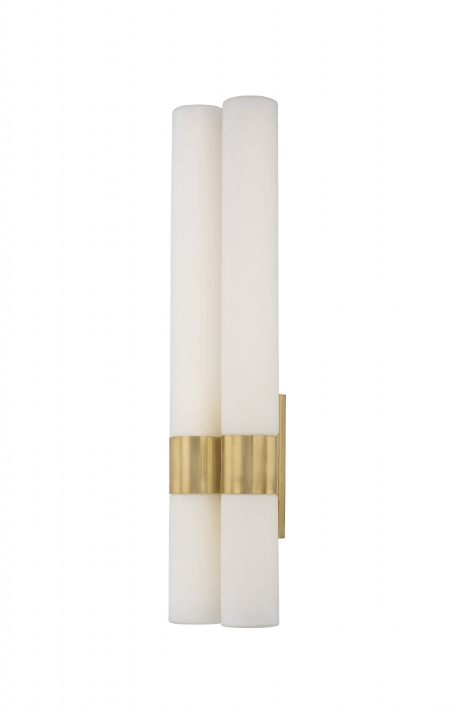 Balerma’s unique design highlights the beauty of matte cloud glass. This double sconce is brought to life by an LED core, revealing the complex veining of the milky glass. Large cuffs and a matching backplate finished in Vintage Brass add a luxurious note of contrast. Whether in a 2 or 4-light format, Balerma is a stylish choice to flank a vanity mirror.