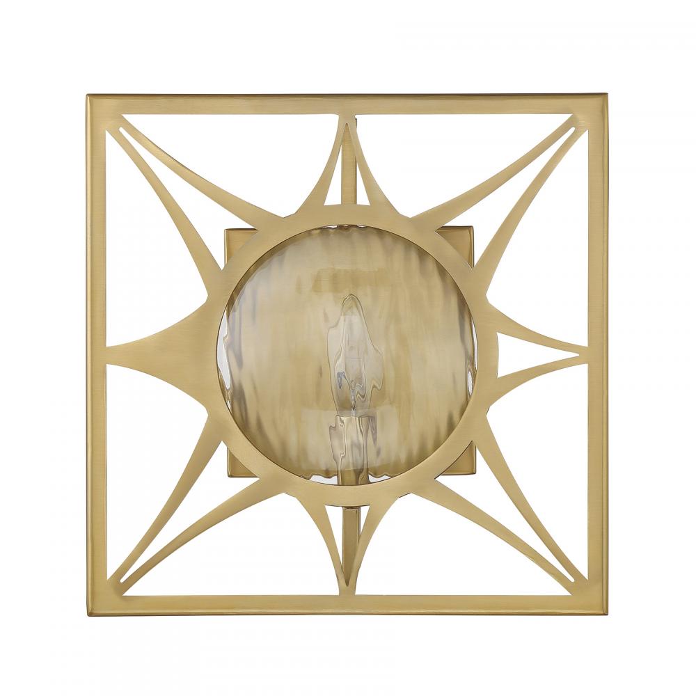 Let your sense of style shine through with the beautiful Balfour 1-light sconce from Savoy House! Its cube-shaped structure wears a Warm Brass finish and is decorated with an eye-catching starburst pattern that holds a circular pane of clear water glass. Balfour is 12" in height, 12" in width and extends 4.5" from the wall. It uses one candelabra size bulb of up to 60 watts. Bulb not included. This sconce is damp area rated.
