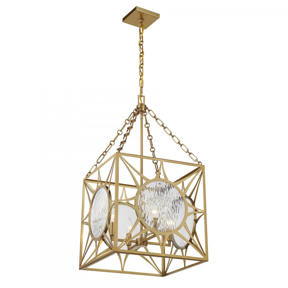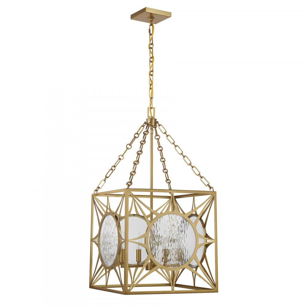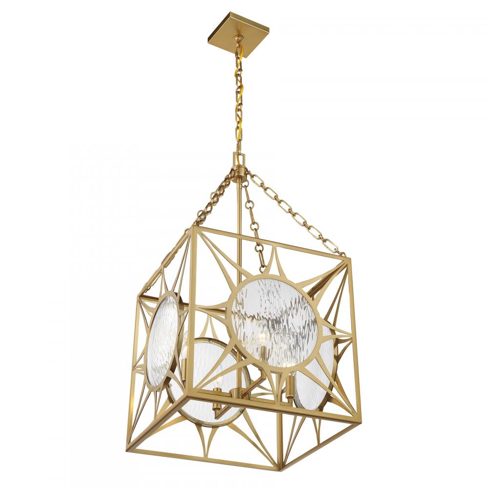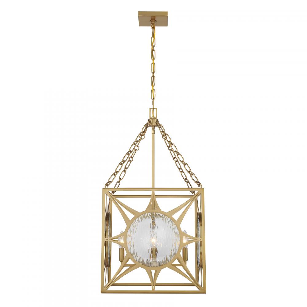 Let your sense of style shine through with the beautiful Balfour 4-light foyer light from Savoy House! Its cube-shaped structure wears a Warm Brass finish and is decorated with eye-catching starburst patterns that hold circular panes of clear water glass. Balfour is 29.5" in height and 17" in width. It uses four candelabra size bulbs of up to 60 watts per bulb. Bulbs not included. Comes with 120" of chain.