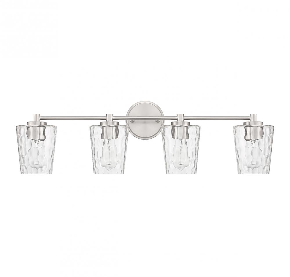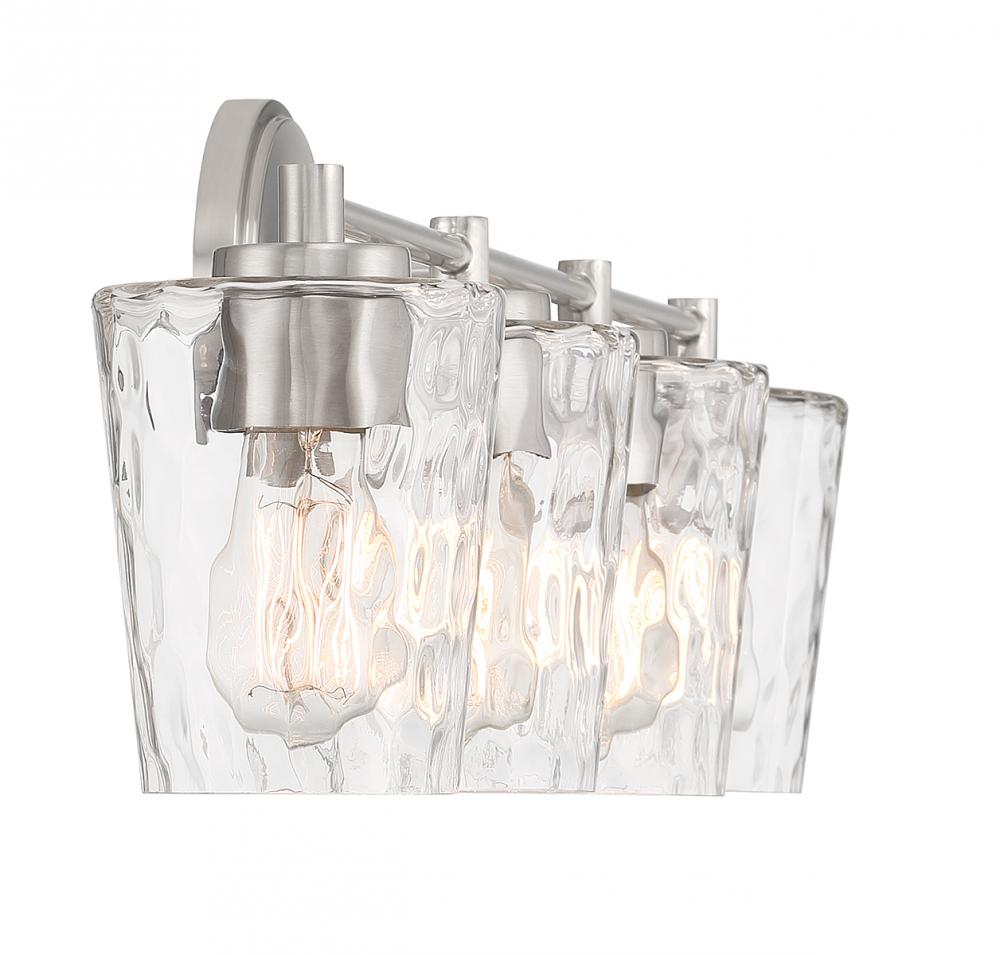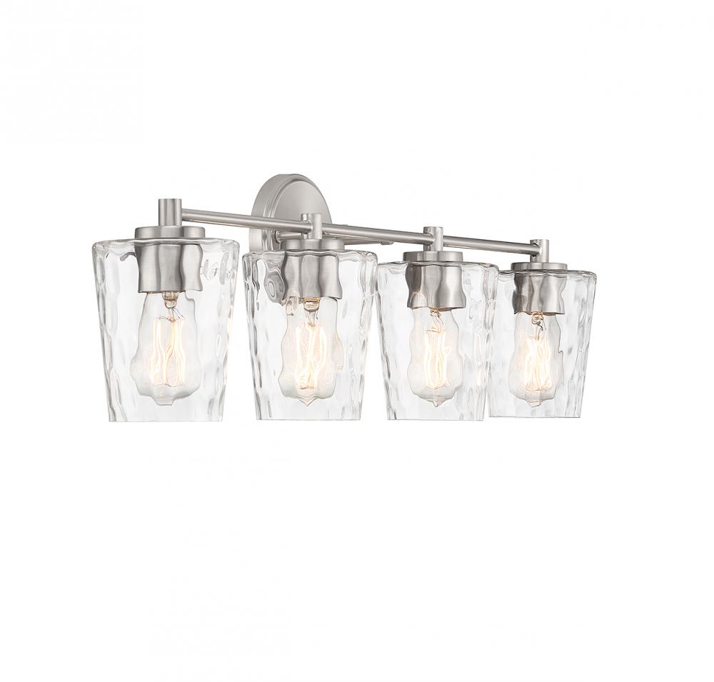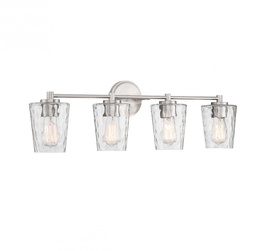 Add a hint of nature-inspired style to your bathroom with the Savoy House Ballas 4-light bath vanity light. Clear hammered glass shades give a watery effect for extra intrigue and dimension. Satin nickel finish. Ballas is 9.75" in height, 31.5" in width and extends 6.5" from the wall. It uses 4 standard size bulbs of up to 60 watts per bulb (bulbs not included).