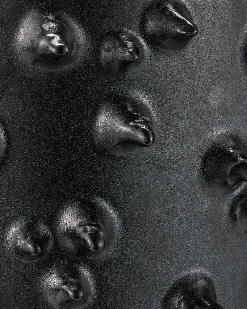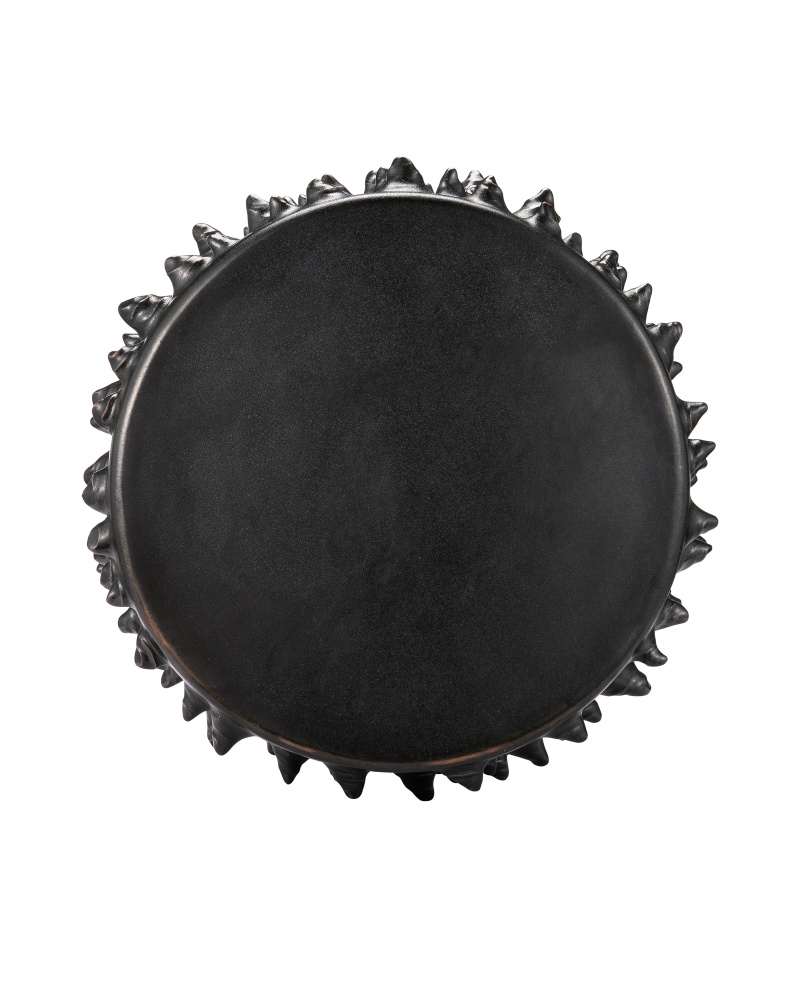 The Baltz Black Accent Table is made of ceramic covered in a rich black glaze. The protrusions that form the dimples on the sides of the table are done by hand by a group of women artisans who live at the border of Burma and Thailand. Then the black glazing is applied. This table is weather-worthy so it can be placed outside.