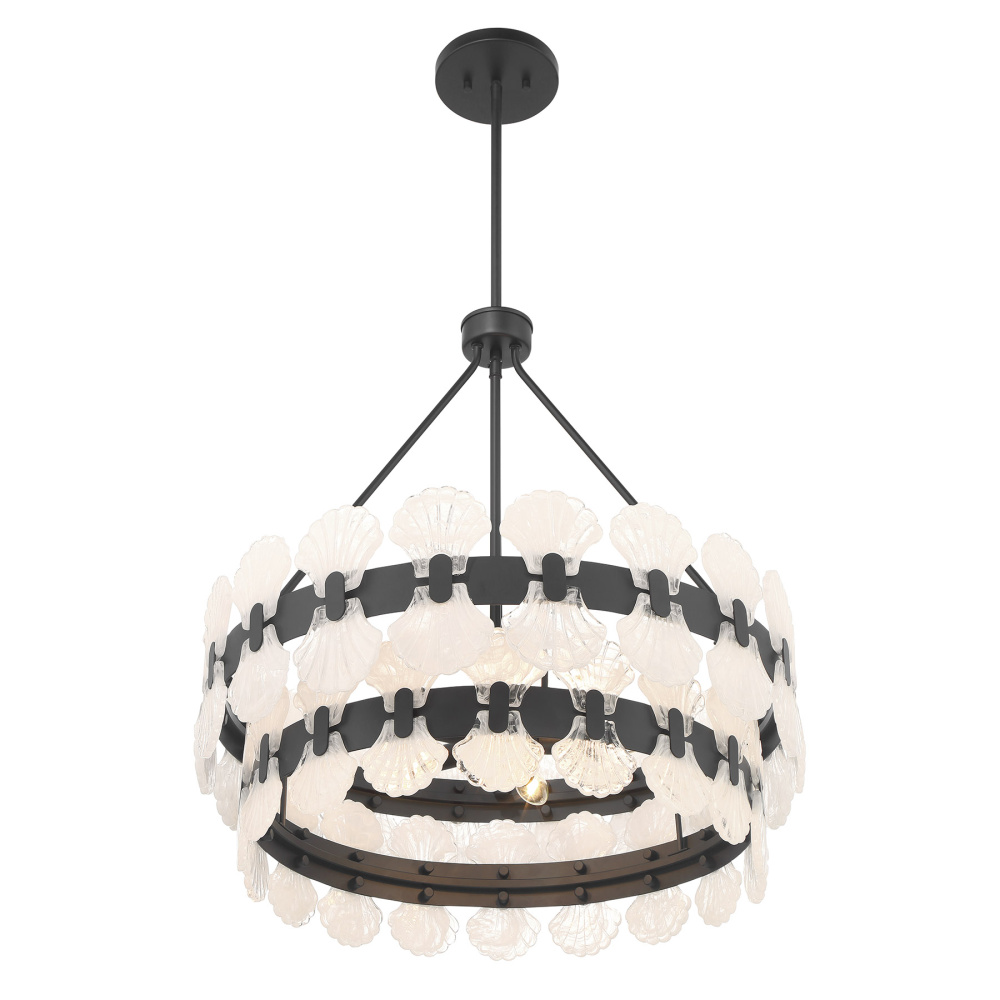 In the Bancroft 5-light chandelier from Savoy House, coastal charm is given a stylish upgrade! Its design is finished in bold Matte Black and decorated with shell shapes crafted from mesmerizing strie glass. Bancroft is 27" in height and 24" in width. It uses five candelabra size bulbs of up to 60 watts per bulb. Bulbs not included. Comes with four 12" downrods and one 6" downrod.