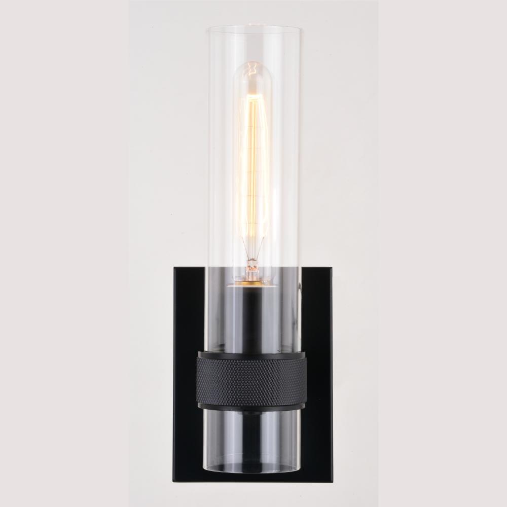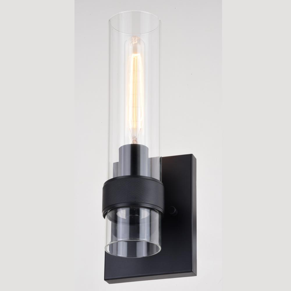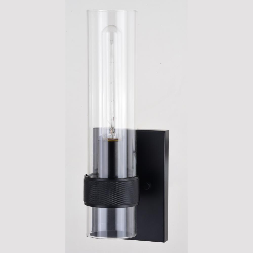 The Bari collection is a blend of simplicity and sophistication featuring a contemporary knurled ring. Ample light emanates from the elongated clear glass shade creating a dramatic effect. Pair with a clear filament bulb for the optimal look. This damp rated wall sconce is ideal for bathrooms, hallways, stairways, and bedrooms.