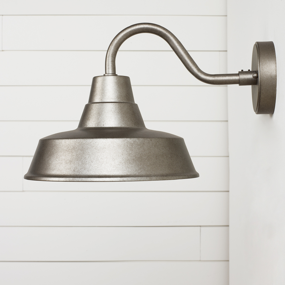 The Barn Light one light outdoor wall fixture in weathered pewter enhances the beauty of your property, makes your home safer and more secure, and increases the number of pleasurable hours you spend outdoors. The classic Barn Lights are hand crafted in aluminum and coated in a Galvanized or Blacksmith finish. Ideal for large or heavily trafficked outdoor areas that need plenty of downward directed light. The oversized Barn Lights make great accents to any commercial lighting plan or residential garage entry, shed, or patio. To customize your look, a 6" extender is included with every fixture. Also available as Dark Sky with four size options to choose from.