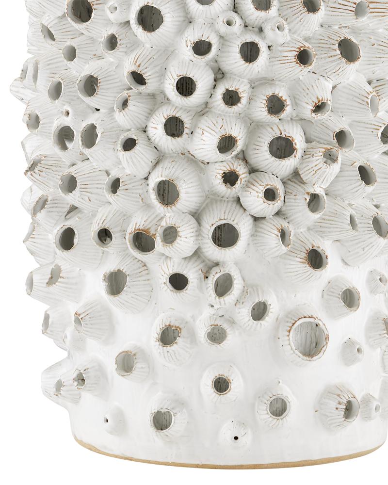 The Barnacle White Accent Table is made by a group of women who live at the border of Burma and Thailand. Made from ceramic, this incredible hand-thrown table is completely covered in handmade ornamentations that look like small barnacles. Once the decorative elements are in place, the vase is glazed with an antique white that provides the table with its depth and personality.