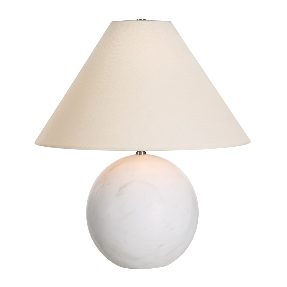The Basalla table lamp is set to become the fashionable sidekick your room update has been waiting for. Blending form and function, it features a stunning honed Volakas marble base in tones of white that complements many styles of interior. The perfect bedroom or living room table lamp, its generously sized tapered off-white linen shade is held up by a brushed nickel plated fitting that when combined with its included bulb, shed a warm glow throughout the room. Beautiful on its own or paired up for double duty, this dimmable lamp will make a timeless and memorable statement in any space.