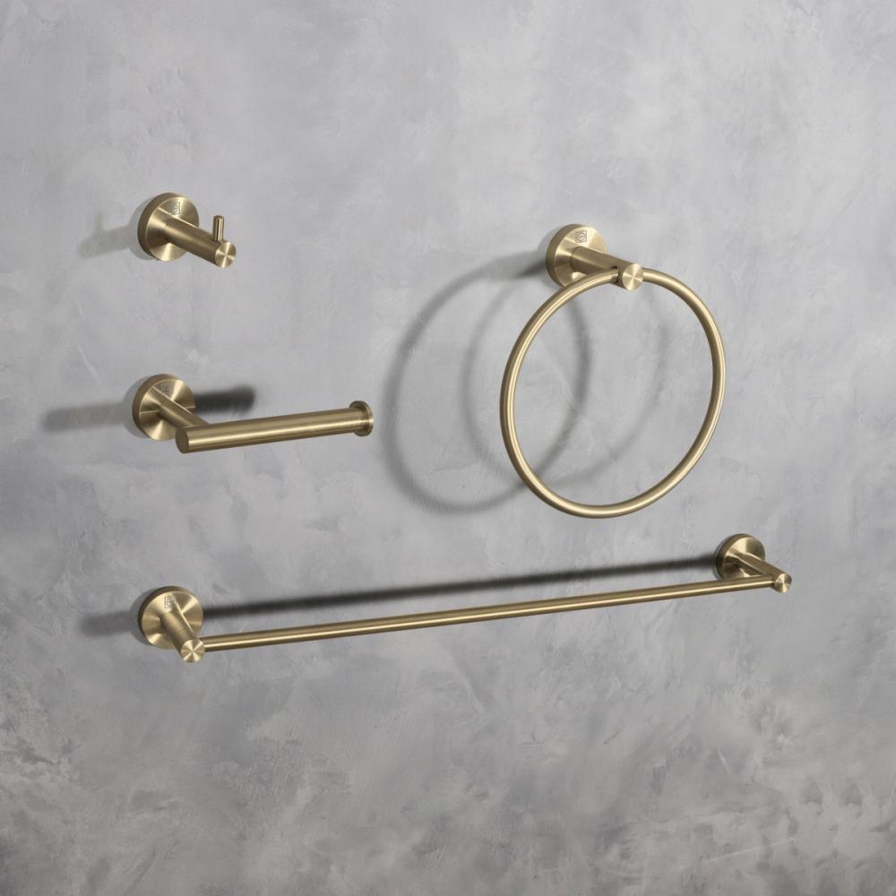 This set comprises a 22.5" long towel bar, a 6.3" long open-ended toilet paper holder, a 2.83" long towel/robe hook, and a 7.1" diameter towel ring, offering a comprehensive solution for your bathroom needs.