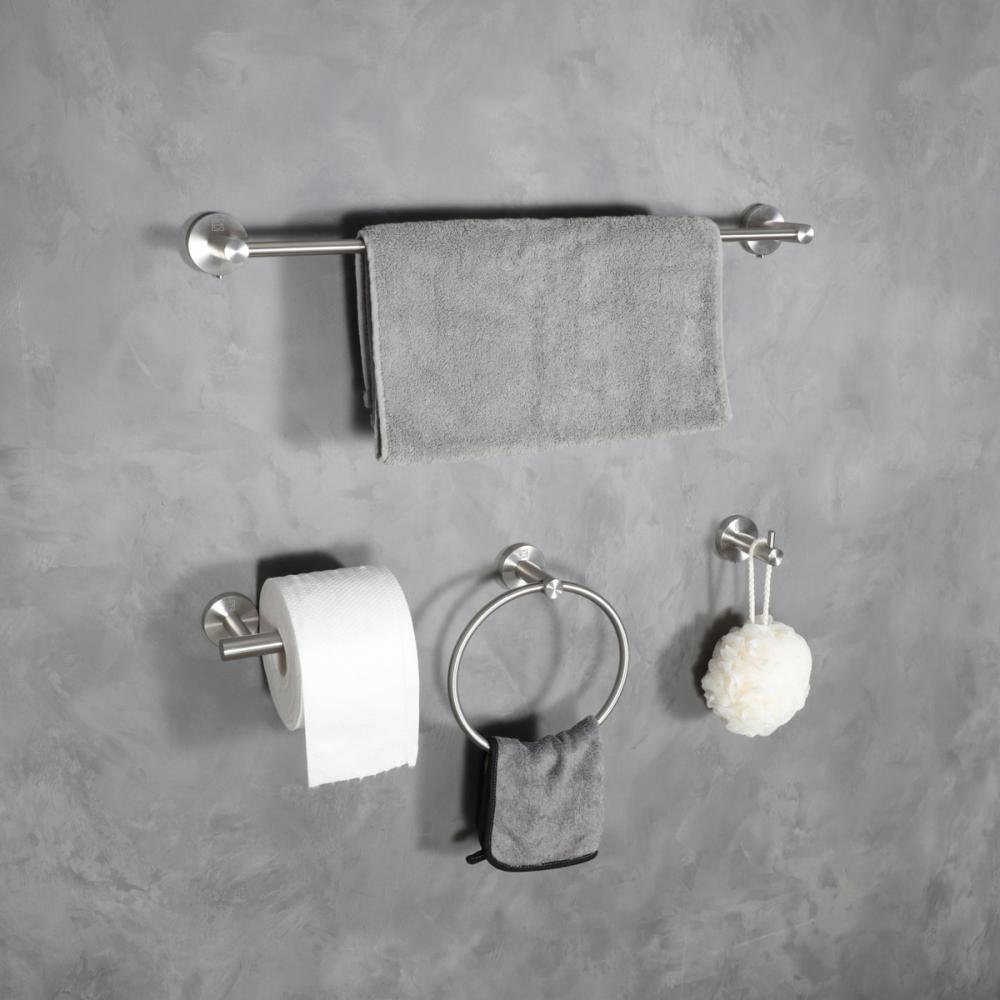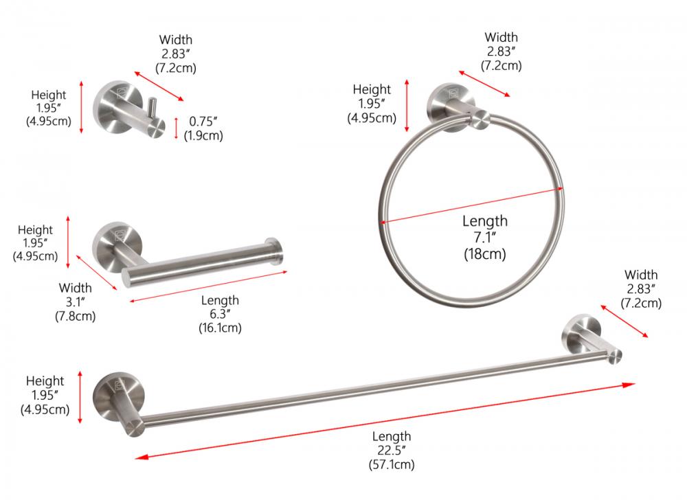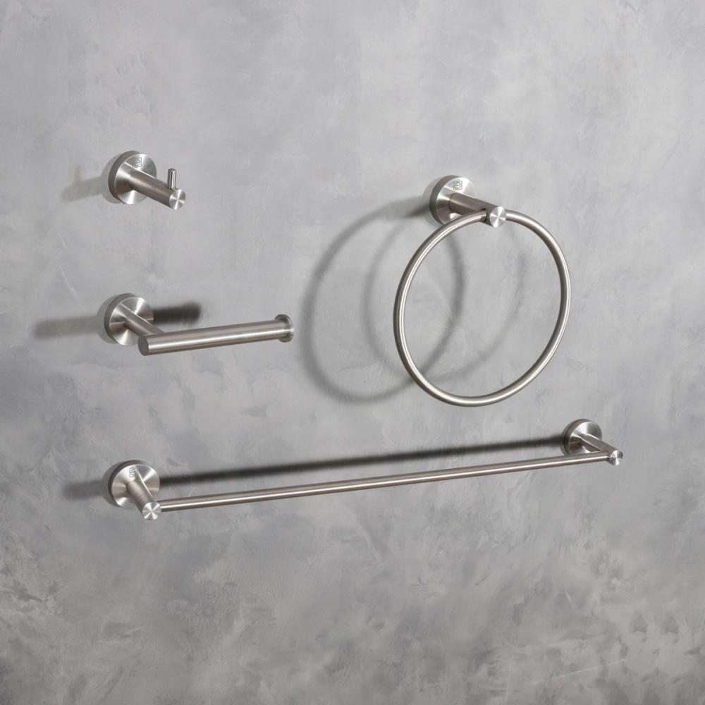 This set comprises a 22.5" long towel bar, a 6.3" long open-ended toilet paper holder, a 2.83" long towel/robe hook, and a 7.1" diameter towel ring, offering a comprehensive solution for your bathroom needs.