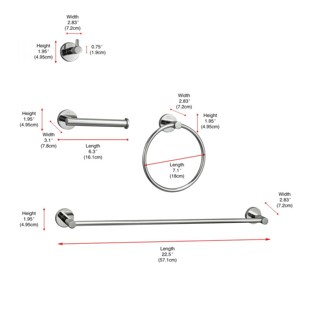 This set comprises a 22.5" long towel bar, a 6.3" long open-ended toilet paper holder, a 2.83" long towel/robe hook, and a 7.1" diameter towel ring, offering a comprehensive solution for your bathroom needs.