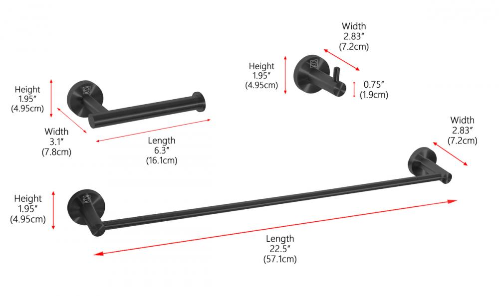 This set includes a 22.5" long towel bar, a 6.3" long toilet paper holder, and a 2.83" long versatile towel/robe hook, offering a complete solution for your bathroom needs.