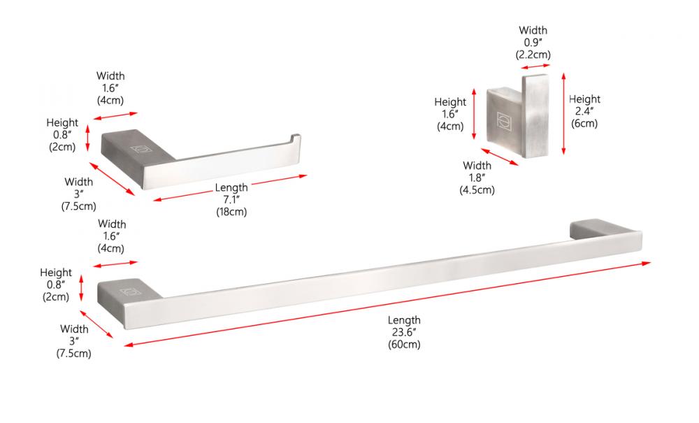 Our bathroom hardware set provides a comprehensive solution for your bathroom, featuring a 23.6" long towel bar, a 7.1" long toilet paper holder, and a 2.4" towel/robe hook.