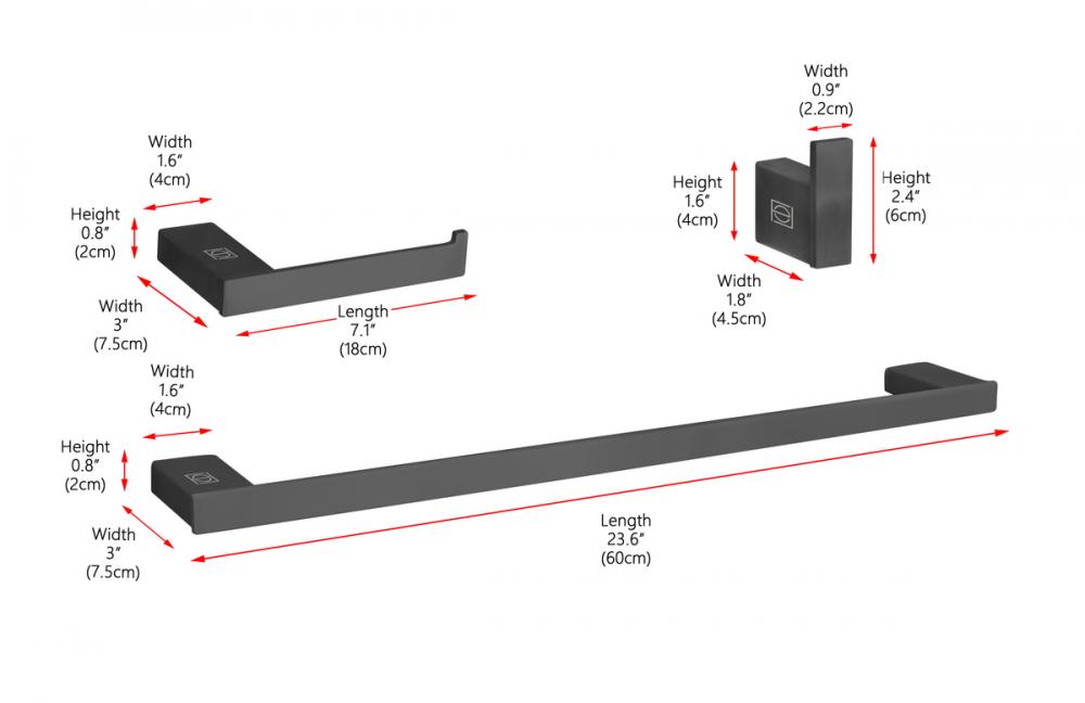 Our bathroom hardware set provides a comprehensive solution for your bathroom, featuring a 23.6" long towel bar, a 7.1" long toilet paper holder, and a 2.4" towel/robe hook.