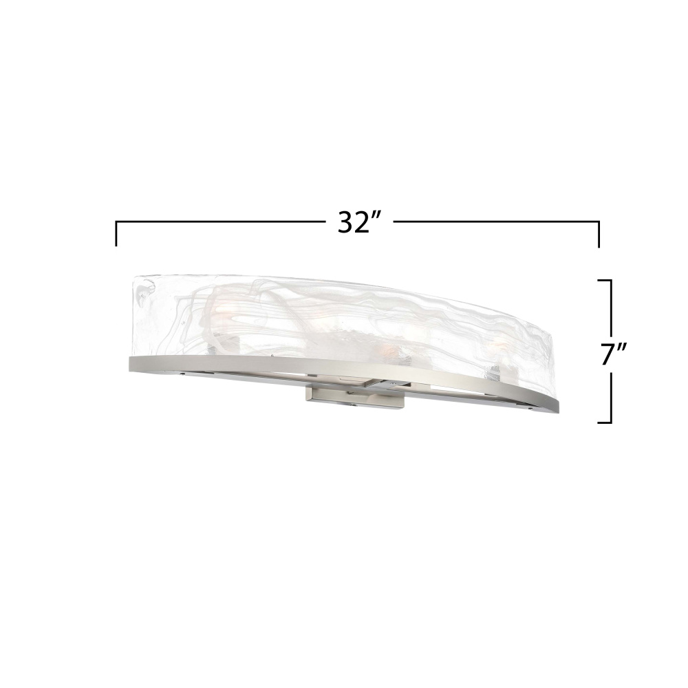 This stunning 4 bathroom sconce exudes timeless elegance, blending a brushed nickel frame with the ethereal beauty of wispy white Murano-style glass panels. Its cylindrical silhouette radiates sophistication, creating a soft, ambient glow perfect for intimate spaces. The craftsmanship of the Skye collection by designer Kevin Kraemer is evident in the graceful harmony between its materials and design. This piece serves as both a functional light source and a work of art, elevating any room with its luxurious charm.