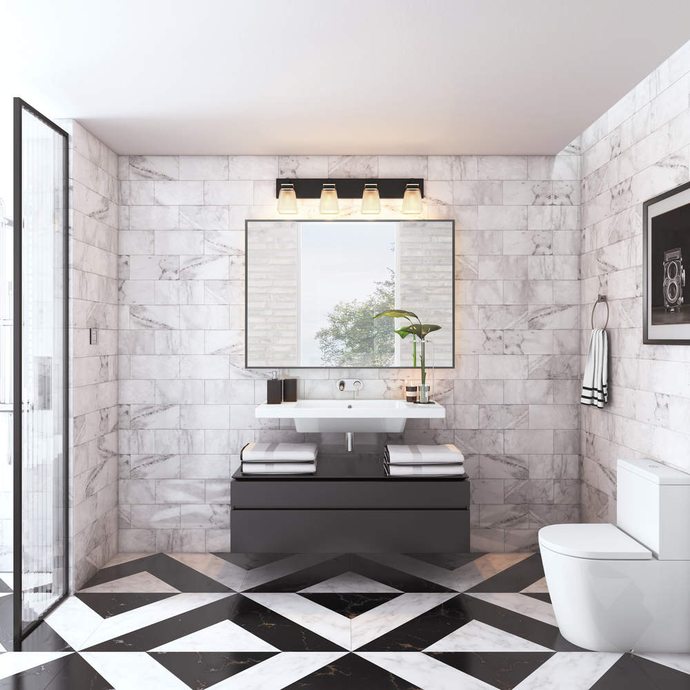 The "Eastwood" collection bathroom vanity features thick frosted glassware with a black frame and plated brushed nickel accents.