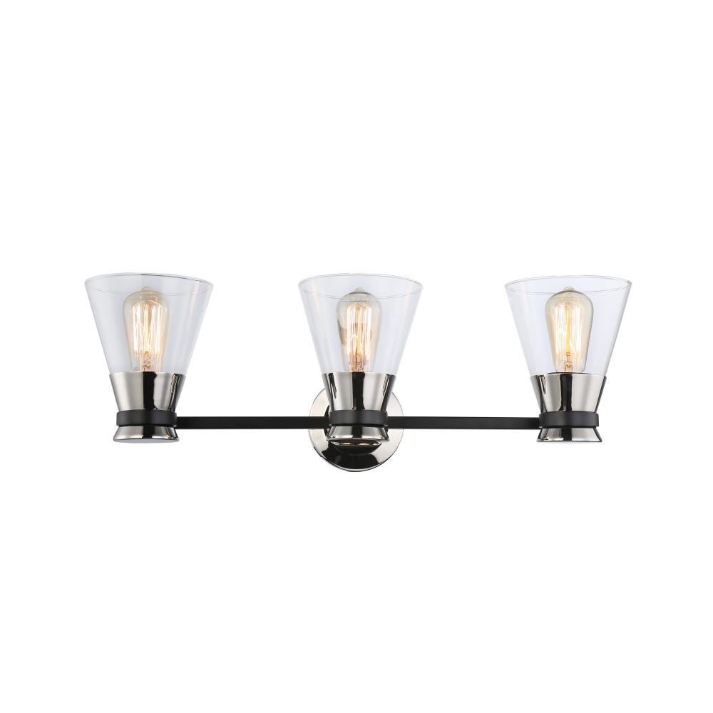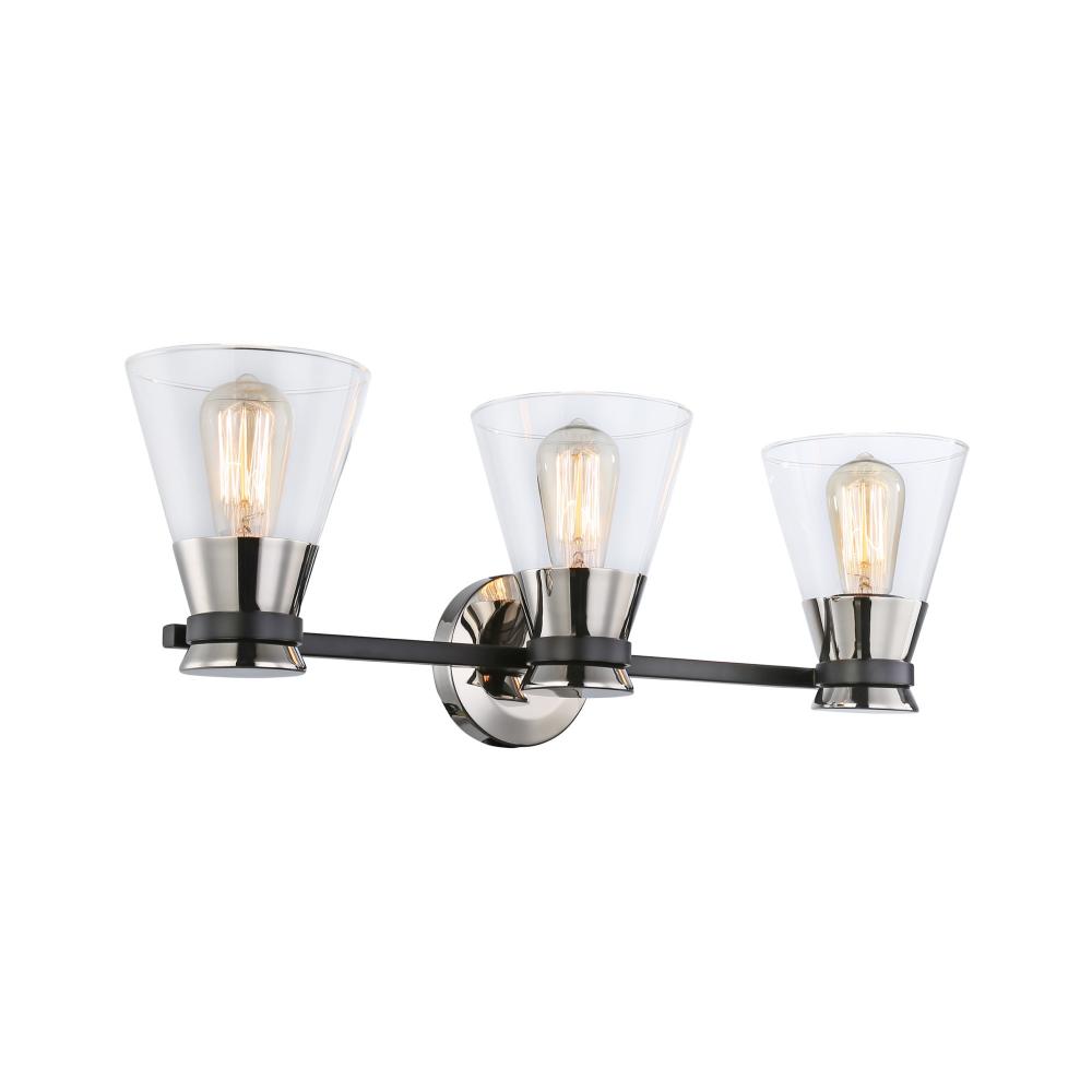 The Kanata collection by designer Kevin Kraemer is unique, stylish and soft. This collection features clear tapered glassware that is held by thin arms that wrap around the cups to finish off the design. The polished nickel cups are complimented with a smooth black finish on the arm banding. 3 light version shown - single and four light versions also available. (Alternate colour option available - Black and brass)