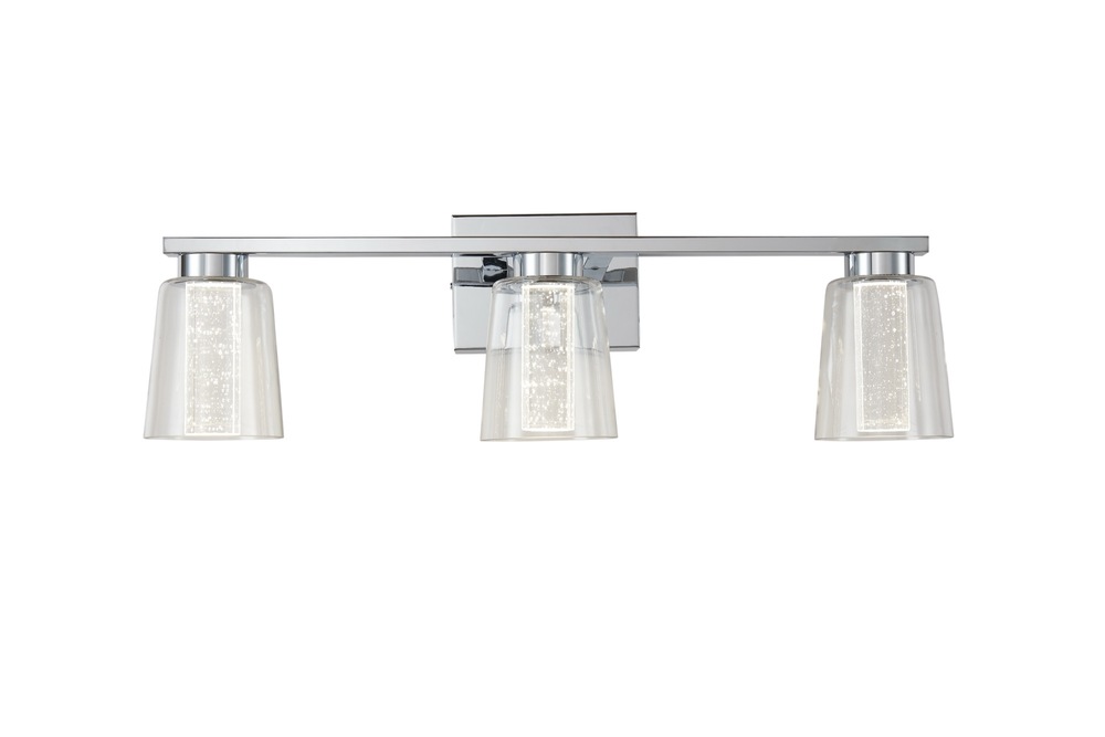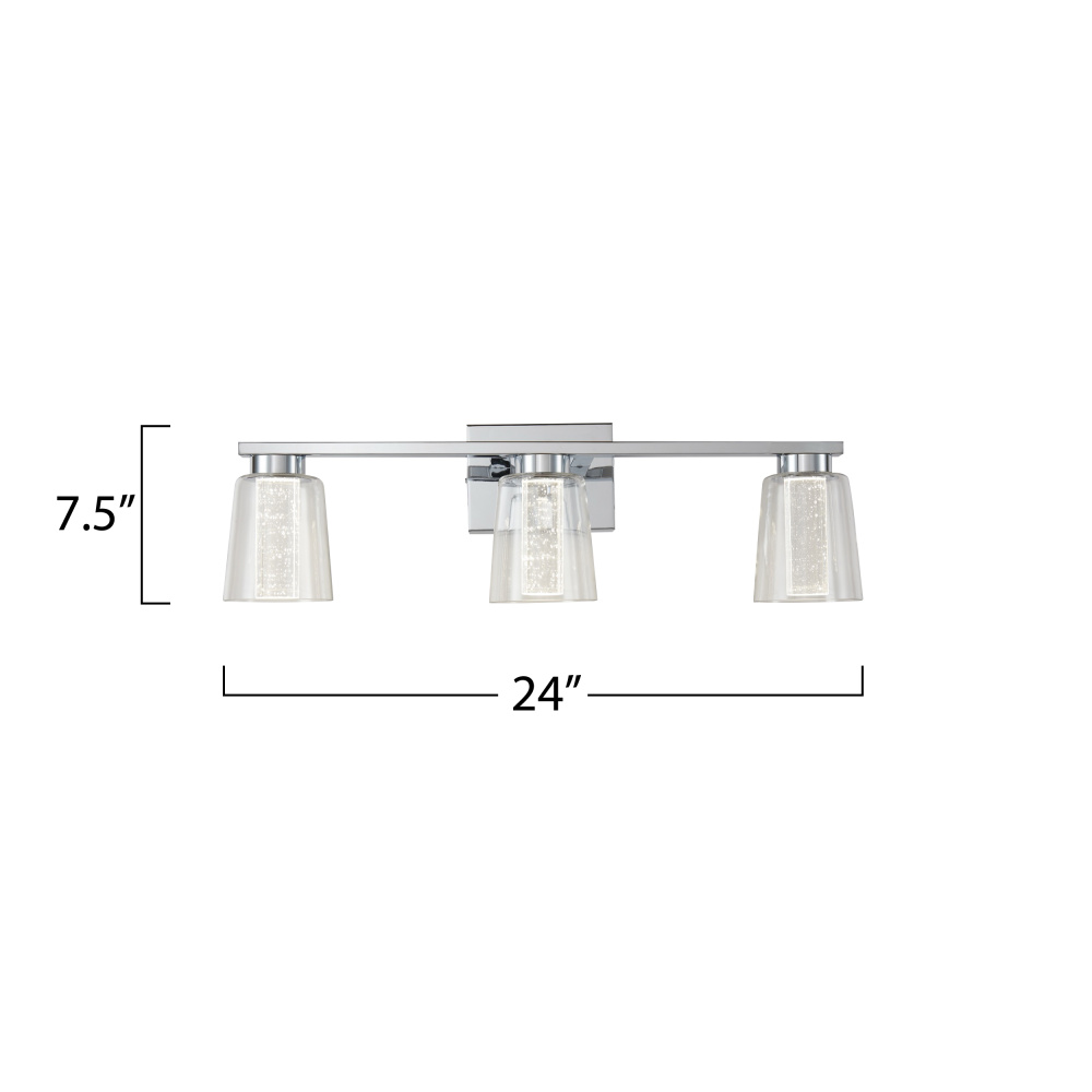 The Dalton Collection features a distinctive design with a clear outer glass surrounding a interior seeded cylinder glass, creating a unique and modern aesthetic. The LED lighting is skillfully integrated to accentuate the seeded glass, providing a visually striking and exceptional effect. Show in with a chrome frame (also available in black). Additionally, these models have a built-in LED switch, allowing users to effortlessly adjust the color temperature from 3000, 4000, and 5000 kelvin for a customizable lighting experience. This collection seamlessly combines functionality with an eye-catching design, making it an elegant choice for any bathroom space. 3 light wall sconce shown. (Also available in a single and 4 light versions.)