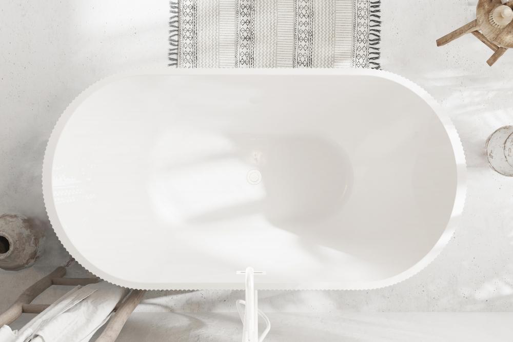 Elevate your bathroom’s aesthetic with this stunning freestanding soaking bathtub, featuring a vertical fluted exterior design that adds texture and sophistication to any space.