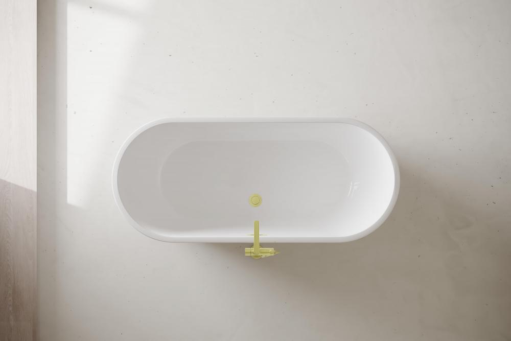 This freestanding bathtub boasts a timeless oval shape, designed to provide both aesthetic appeal and a comfortable bathing experience.