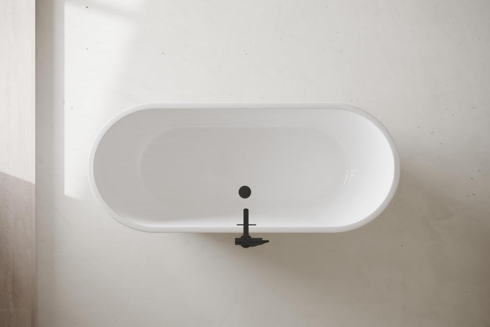 This freestanding bathtub boasts a timeless oval shape, designed to provide both aesthetic appeal and a comfortable bathing experience.