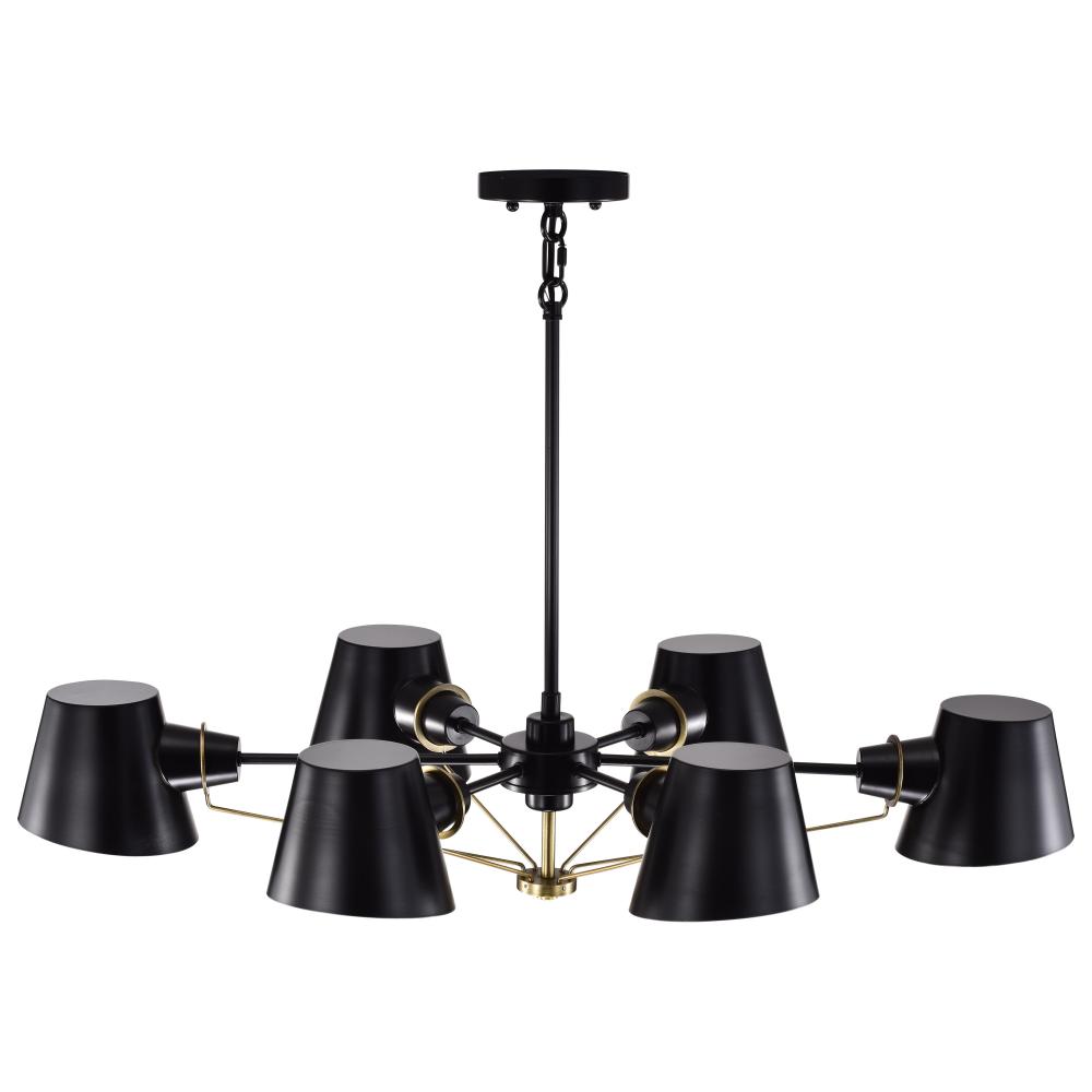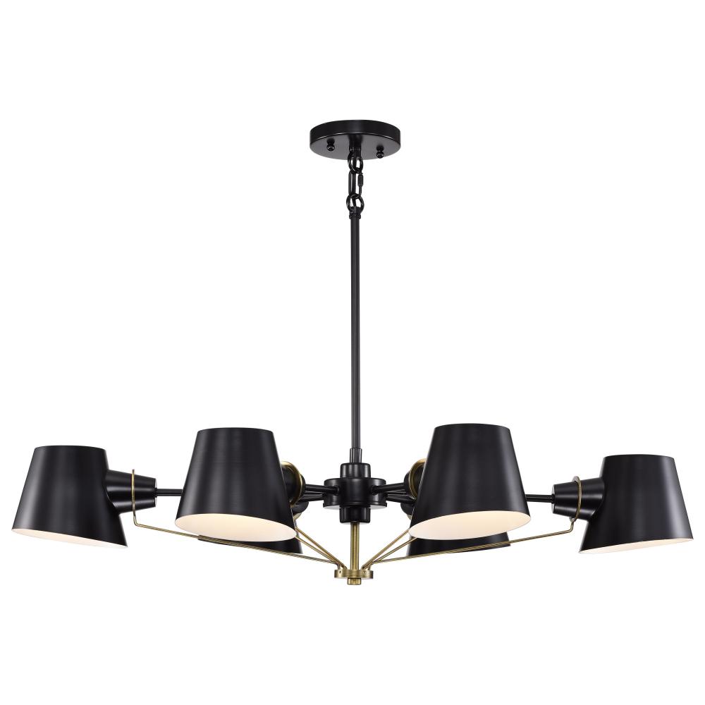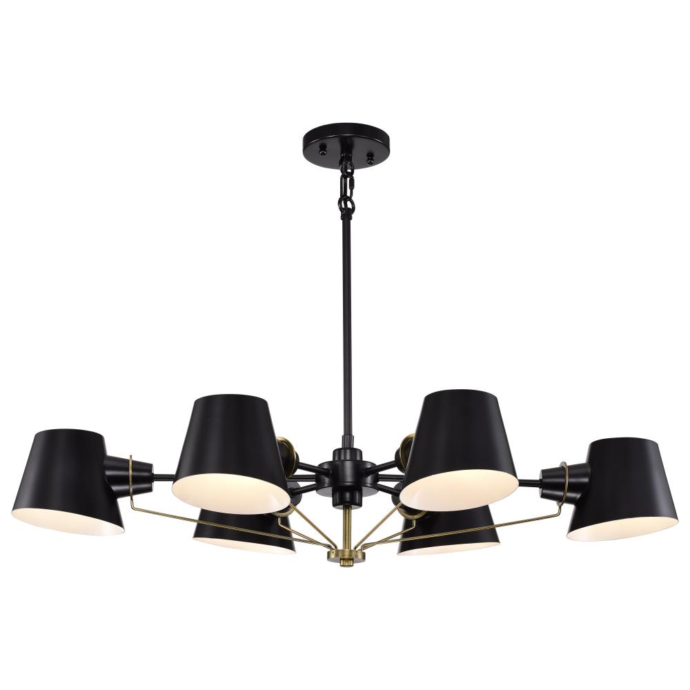 The Baxter six-light chandelier does not disappoint with its modern design and impressionable style. The black shades are finely cut at an angle and feature a white interior to maximize the light output. The lustrous burnished brass stems attach from the l