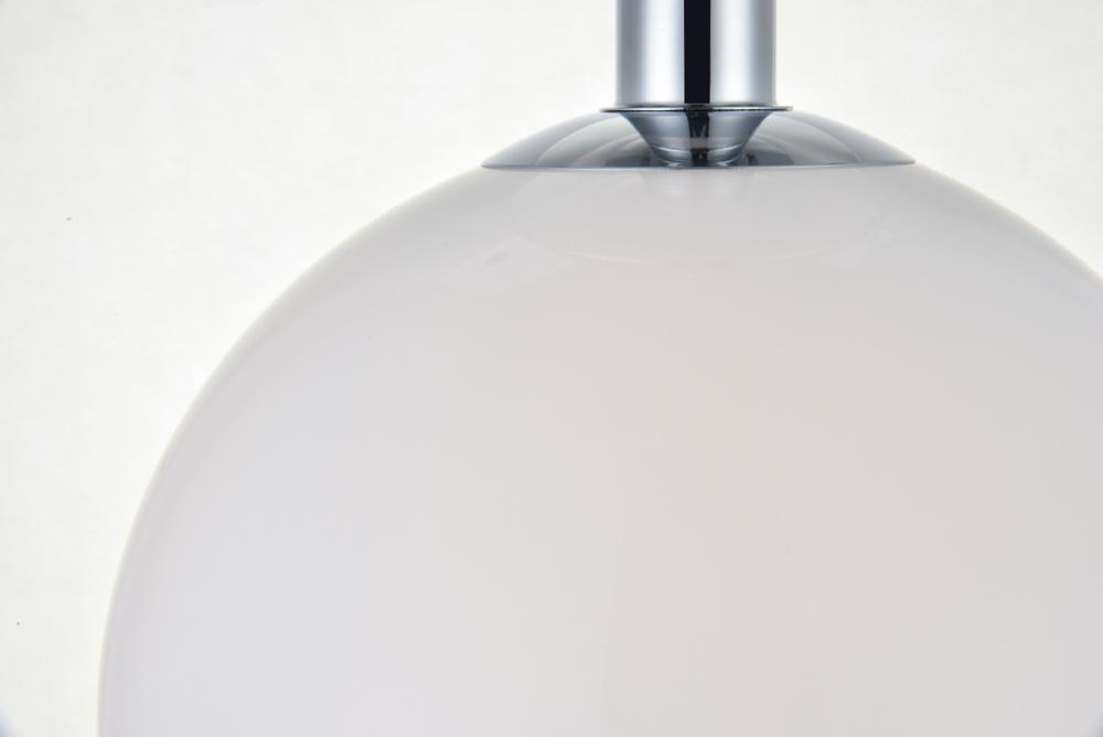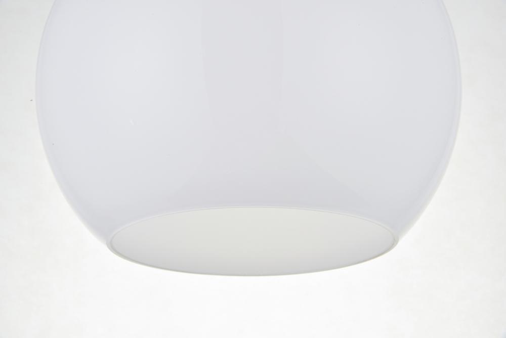 Feature 2: spherical frosted white glass shade with open center for easy bulb replacement