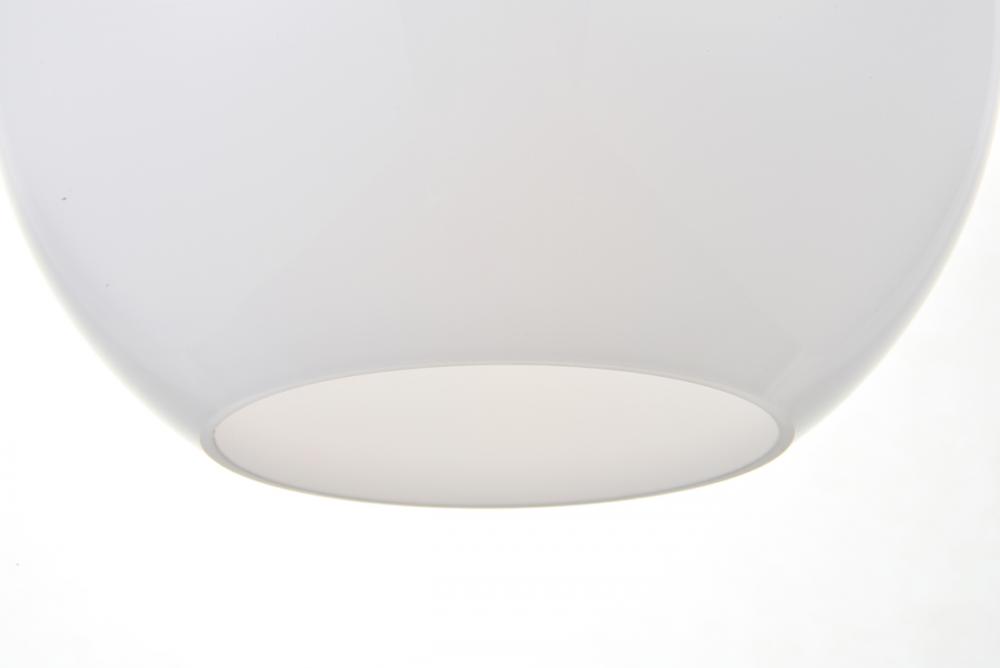 Feature 2: a row of three identical spherical frosted white glass shades with open center for easy bulb replacement; requires incandescent or led e26 bulbs (not included)
