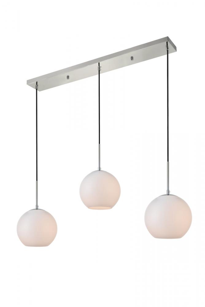 Refined style with a practical design, Baxter hanging pendant lamps bring cosmopolitan sophistication anywhere, especially to an entryway, office, bathroom, bedroom, or kitchen. The smooth iron frame features a rectangular canopy and comes in a chrome finish. Adjustable black cords allow you to vary the hanging height from 14 to 87 inches. A row of three identical frosted white spherical glass shades remain open at the center to allow for effortless replacement of the filament-style bulbs (not included). Living in the big city has never been this easy.