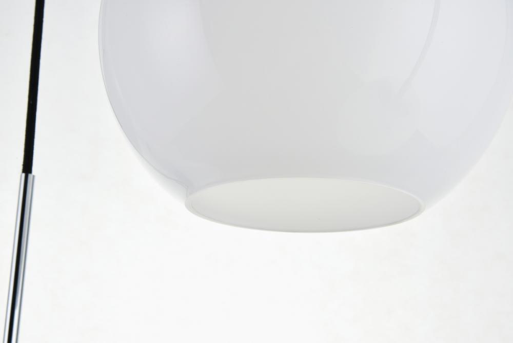 Feature 2: a row of three identical spherical frosted white glass shades with open center for easy bulb replacement; requires incandescent or led e26 bulbs (not included)