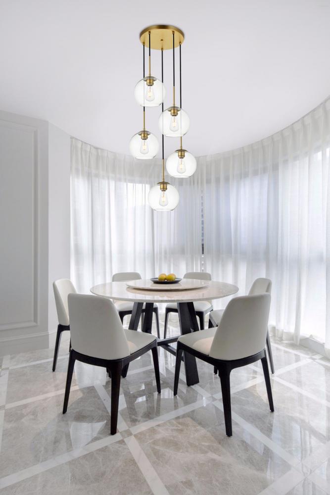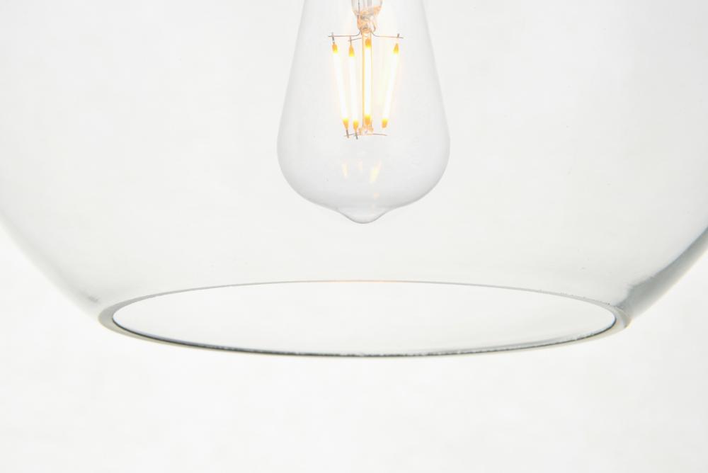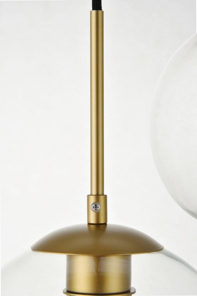 Feature 2: five identical spherical clear glass shades with open center for easy bulb replacement;