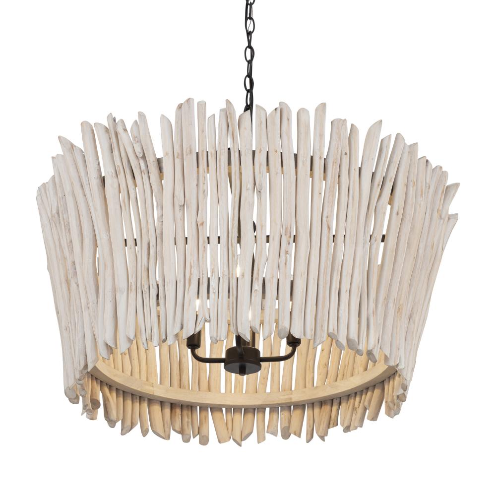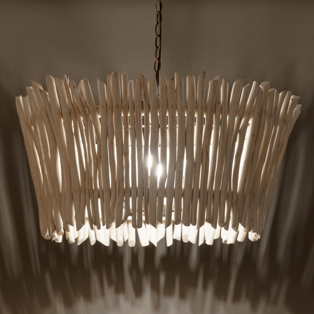 Staggered branches of eucalyptus are meticulously linked together to form a tapered bouquet shade, showcasing exceptional handcraftsmanship. Each branch is individually shaped, with the wood finished in a hand-applied Weathered White that beautifully compl