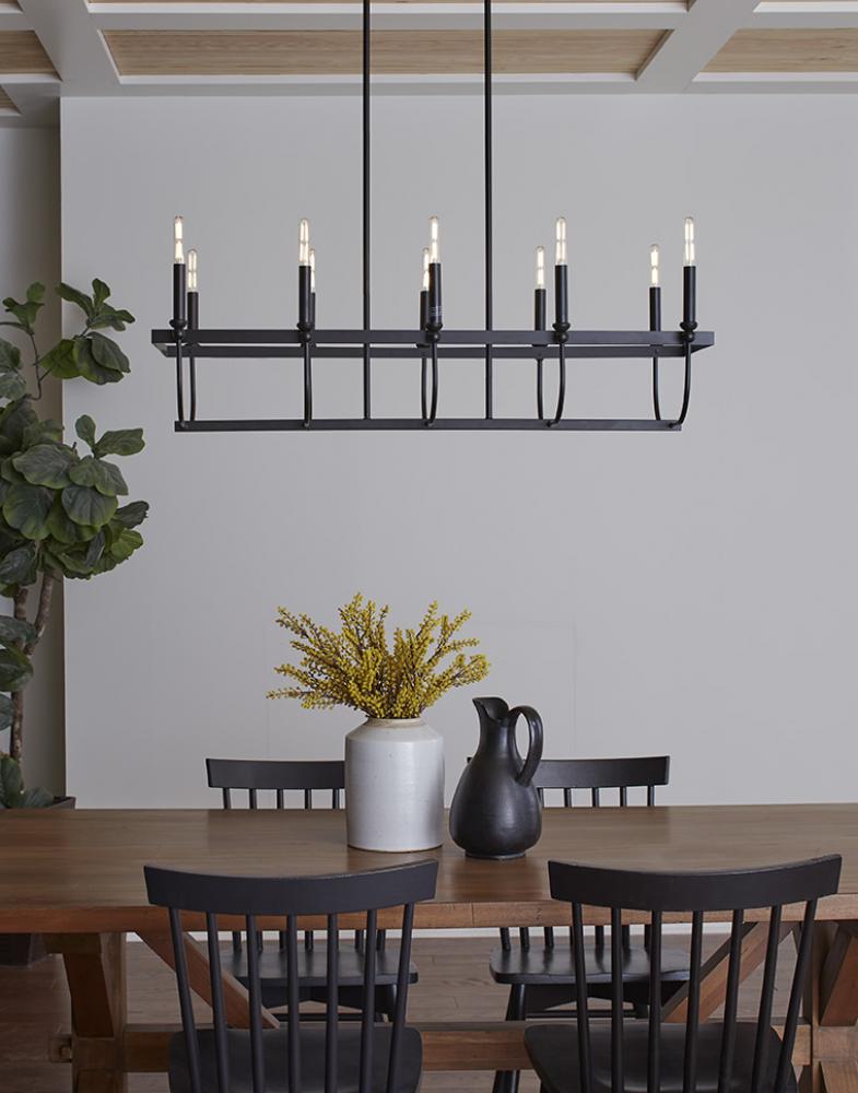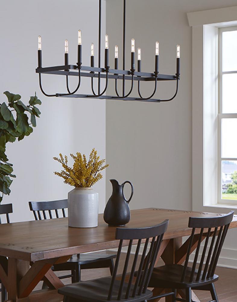 The Beckett island light features a simple design in a county-industrial style. It can be dressed up or down depending on the type of light bulbs used. This charming fixture is available in a popular matte black finish.