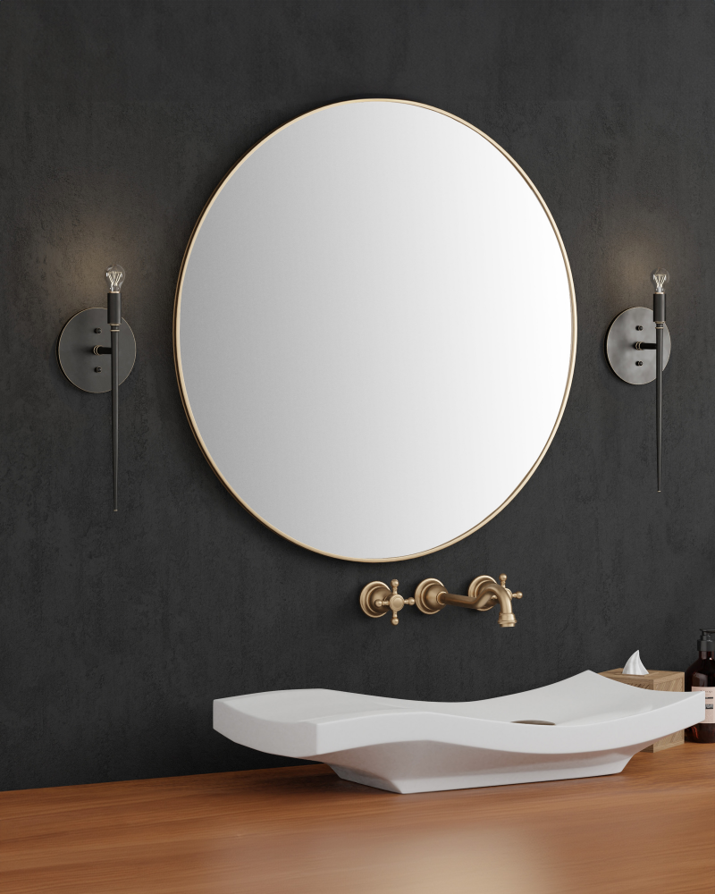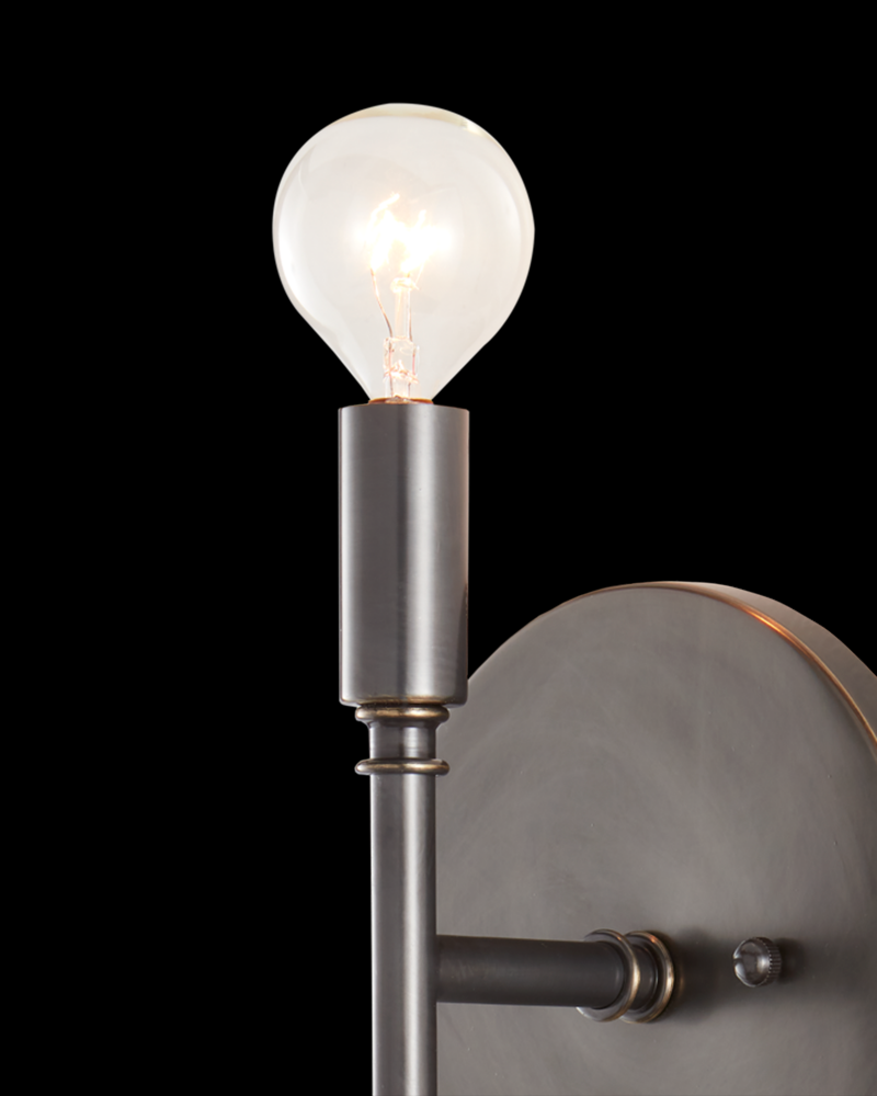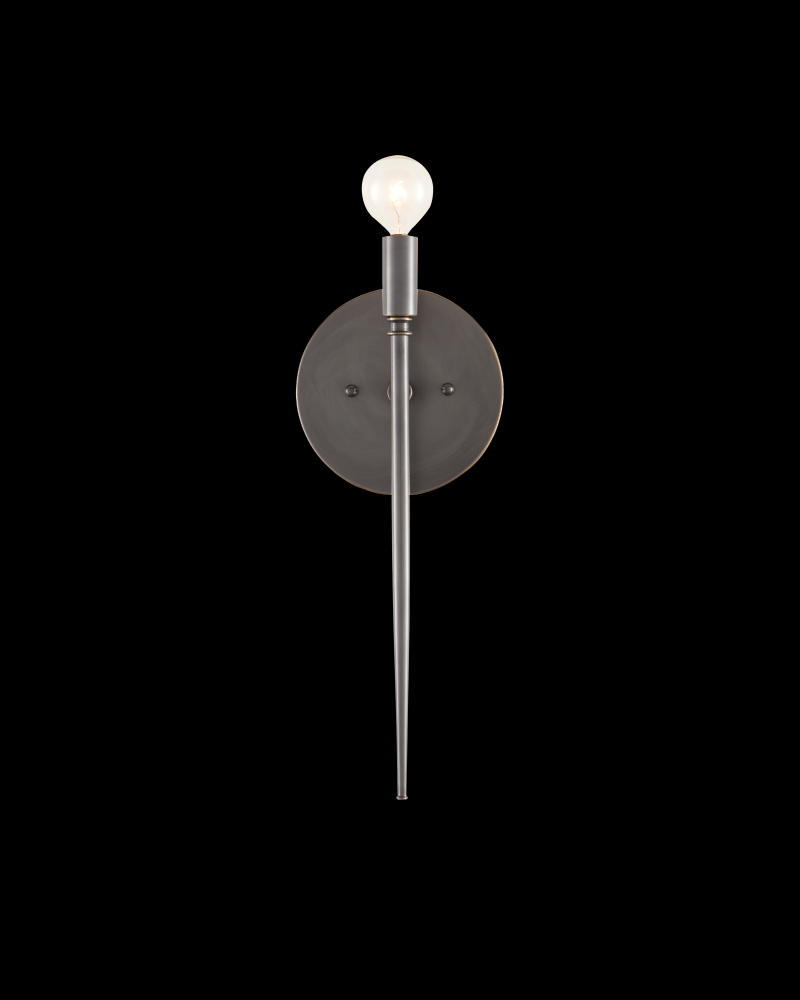At first glance the Bel Canto Bronze Wall Sconce has few distinctive design elements but a longer look brings the raised circlets of metal near the light source and at the point where the stem attaches to the wall-plate into view. There's also a hint of one as the narrowing point of its body reaches its culmination as gracefully as an opera conductor's wand. The black wall sconce is made of metal in an oil-rubbed bronze finish, and is ADA compliant and certified for damp locations. Part of the Bagno Collection of wall sconces designed for bathroom spaces.