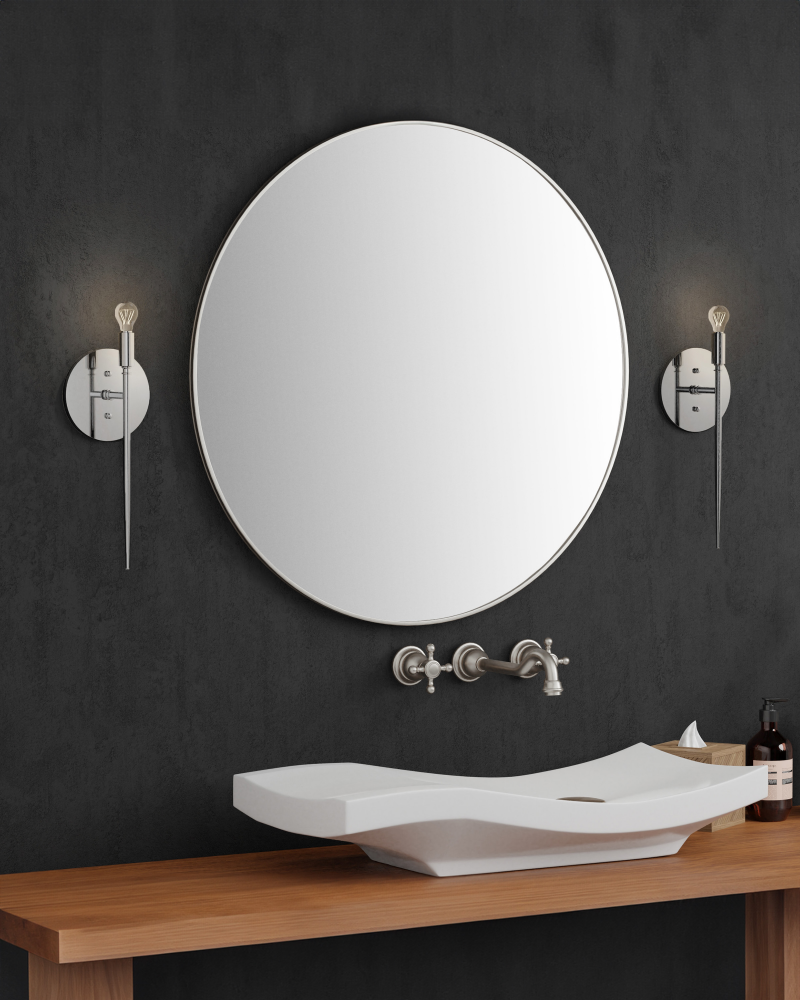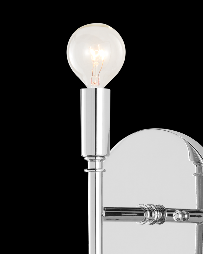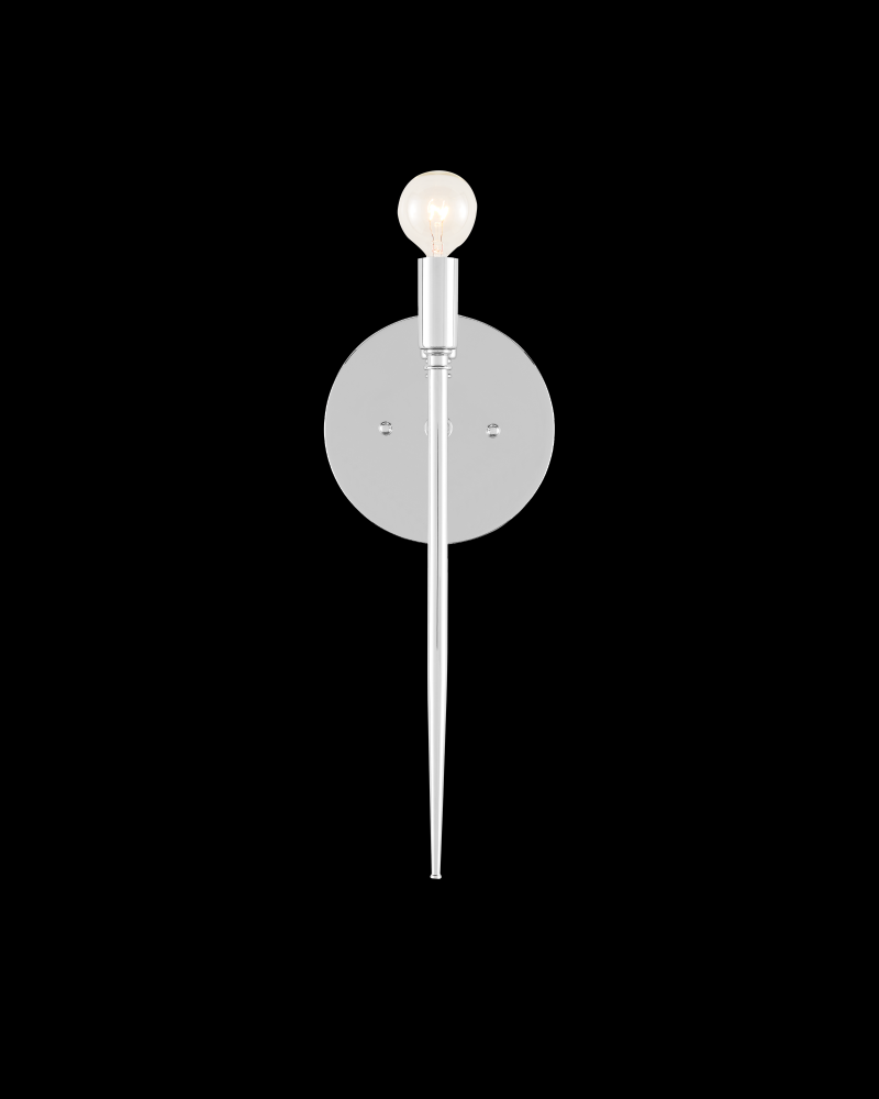 At first glance the Bel Canto Nickel Wall Sconce has few distinctive design elements but a longer look brings the raised circlets of metal near the light source and at the point where the stem attaches to the wall-plate into view. There's also a hint of one as the narrowing point of its body reaches its culmination as gracefully as an opera conductor's wand. The silver wall sconce is made of metal in a polished nickel finish, and is ADA compliant and certified for damp locations. Part of the Bagno Collection of wall sconces designed for bathroom spaces.