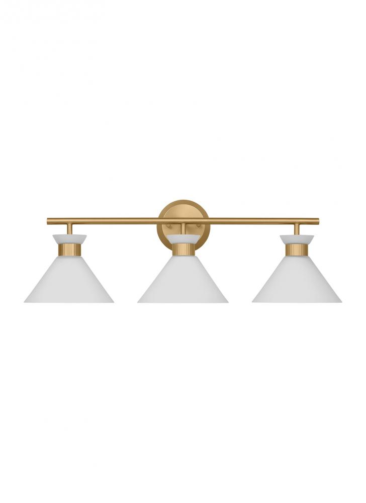 Inspired by playful mid-century modern design, the Drew & Jonathan Belcarra Three Light Wall / Bath Sconce is accentuated by a flared glass shade with ribbed metal details and etched white glass that bestows an almost whimsical touch to the clean design. Available in three finishes, Brushed Steel, Midnight Black, and Satin Brass, the Belcarra looks great on its own or installed above a bathroom vanity. This fixture may be mounted in the up or down position, and is cETL listed for damp locations, making it the perfect lighting solution for any space.