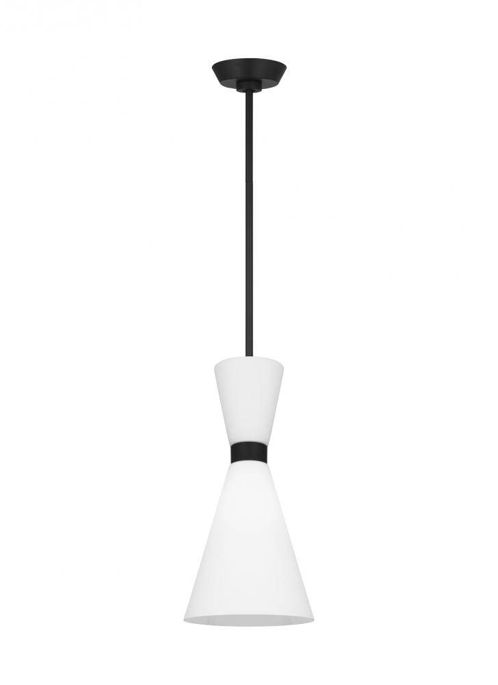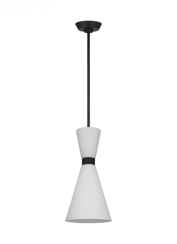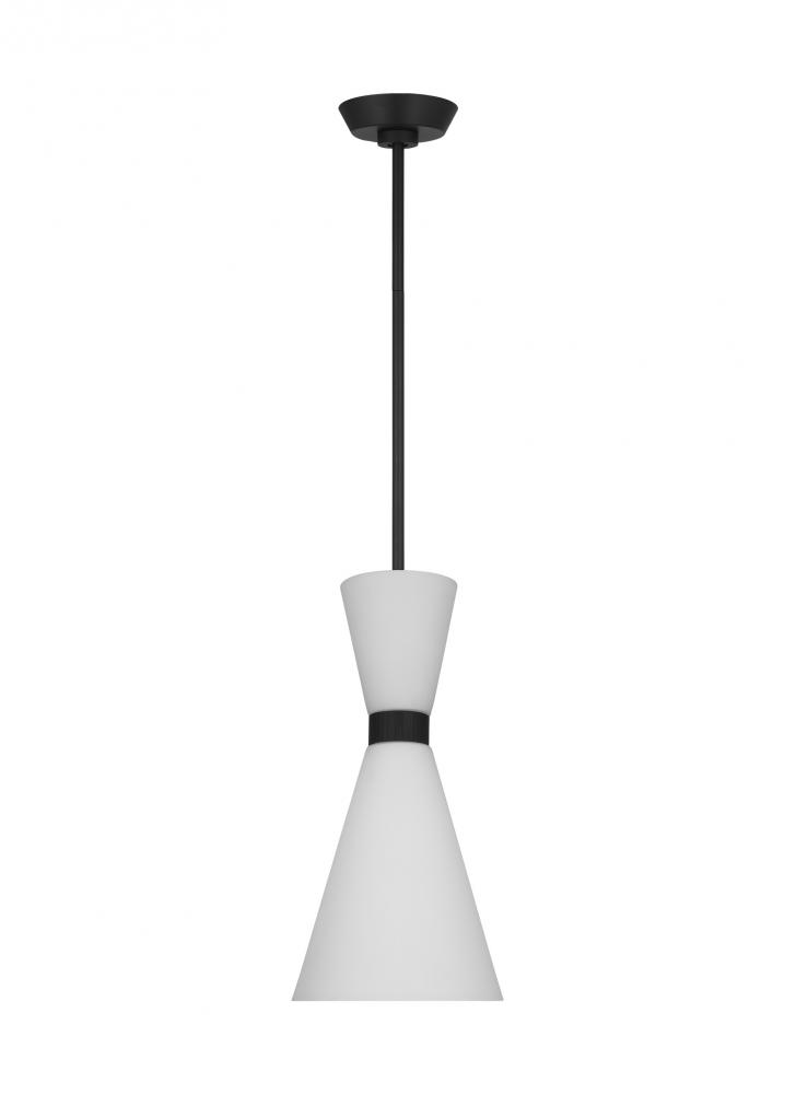Inspired by playful mid-century modern design, the Drew & Jonathan Belcarra Small Pendant is accentuated by a flared glass shade with ribbed metal details and etched white glass that bestows an almost whimsical touch to the clean design. Available in three finishes, Brushed Steel, Midnight Black, and Satin Brass, the Belcarra looks great on its own or when grouped in multiples. This product may be mounted on a sloped ceiling and is cETL listed for damp locations, making it the perfect lighting solution for any space.