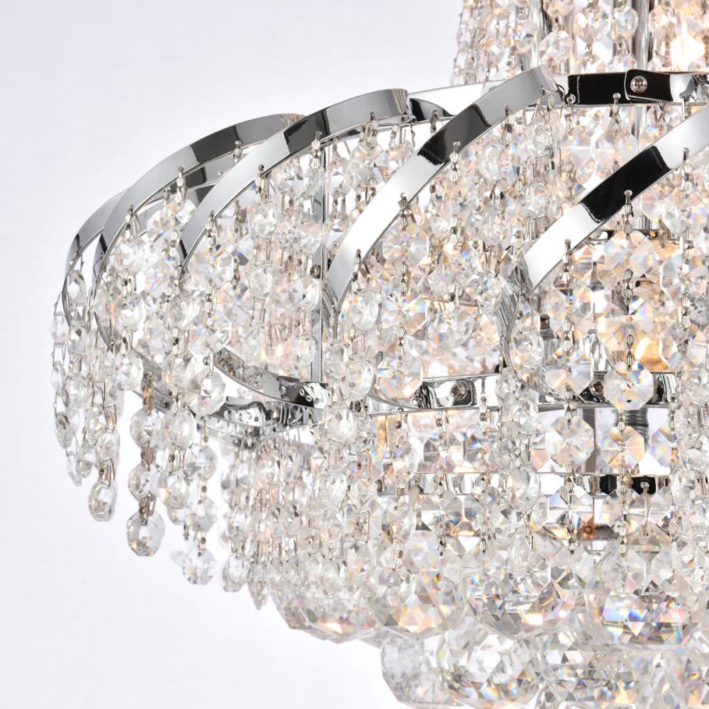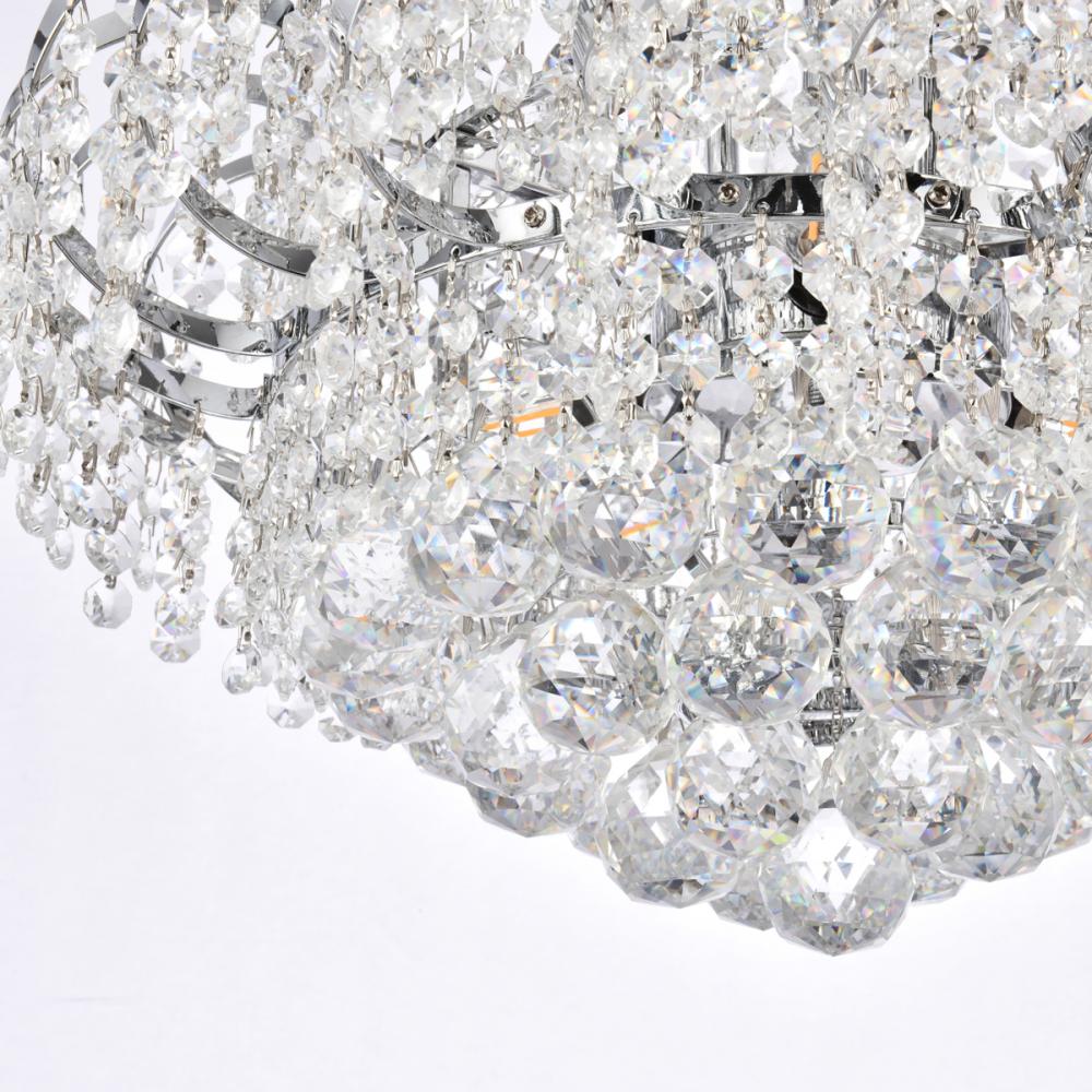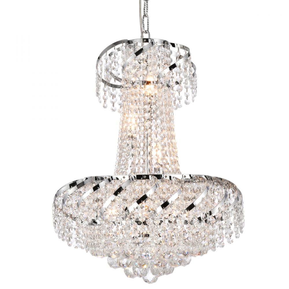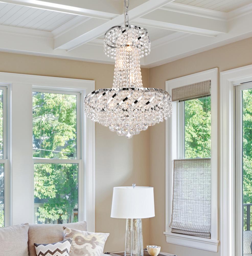 A luxurious take on the classic empire chandelier, Belenus collection hanging fixtures add glamour to a dining room, stairwell, or living room. Curls of gold or Silver spiral along the top of this chandelier while clear octagon crystal strands drape downward to a profusion of crystal balls for the ultimate refraction from any angle. Soft candelabra bulbs (not included) are tucked inside to create a warm glow hidden within. Available in a gold or chrome finish.