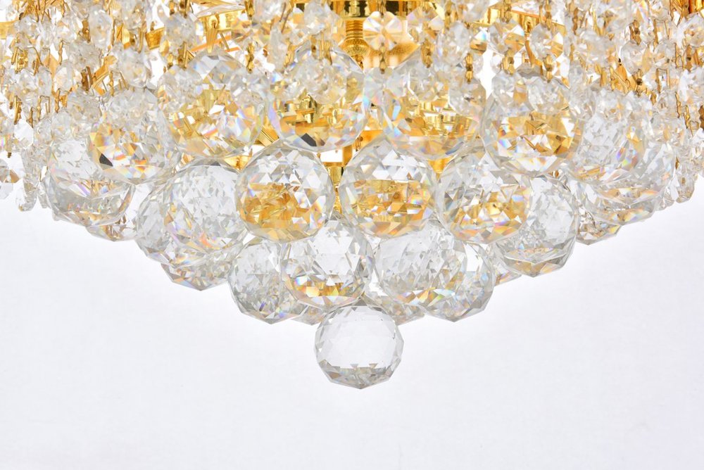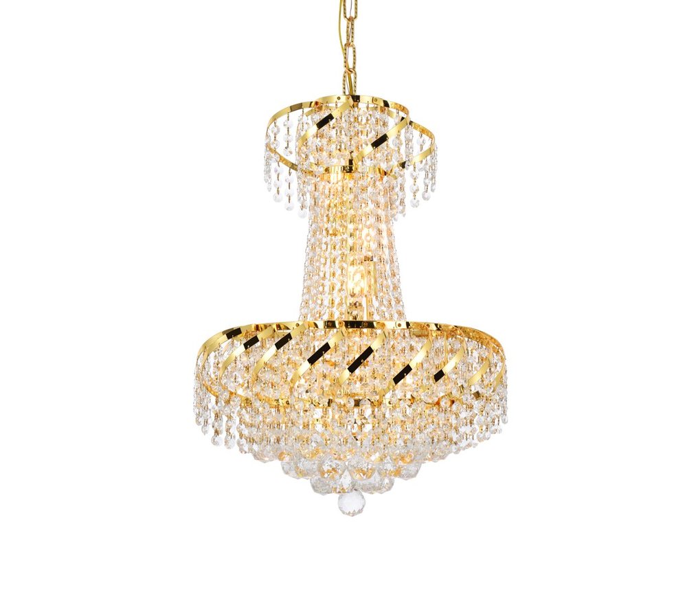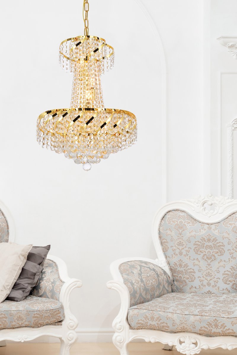 A luxurious take on the classic empire chandelier, Belenus collection hanging fixtures add glamour to a dining room, stairwell, or living room. Curls of gold or Silver spiral along the top of this chandelier while clear octagon crystal strands drape downward to a profusion of crystal balls for the ultimate refraction from any angle. Soft candelabra bulbs (not included) are tucked inside to create a warm glow hidden within. Available in a gold or chrome finish.