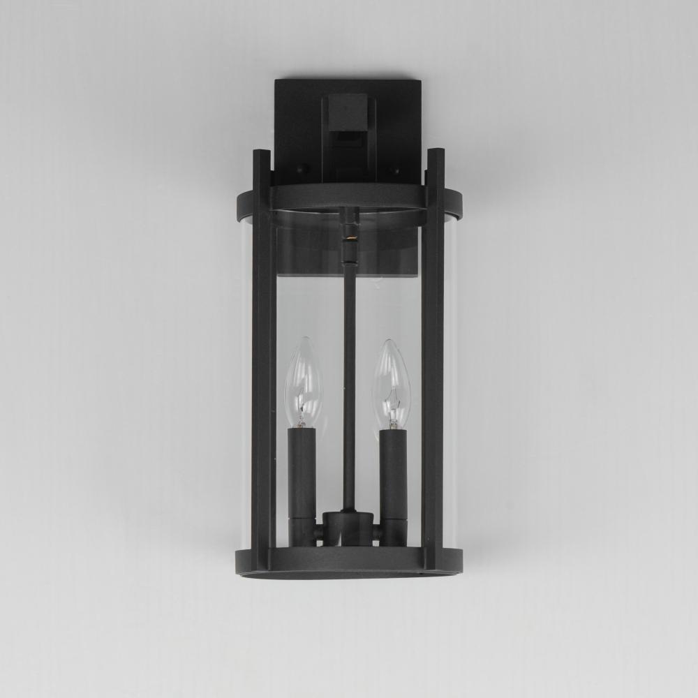 Squared columns in Matte Black finish tower above the cylindrical glass shade rated for outdoor applications. Available in a more modern clear glass option or hammered glass. A rectangular hook detail carries the square form through to the backplate. A mod