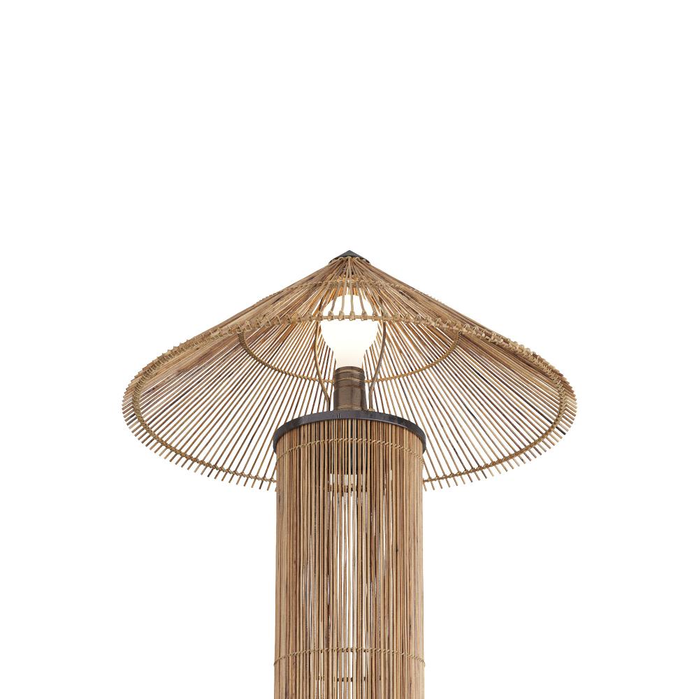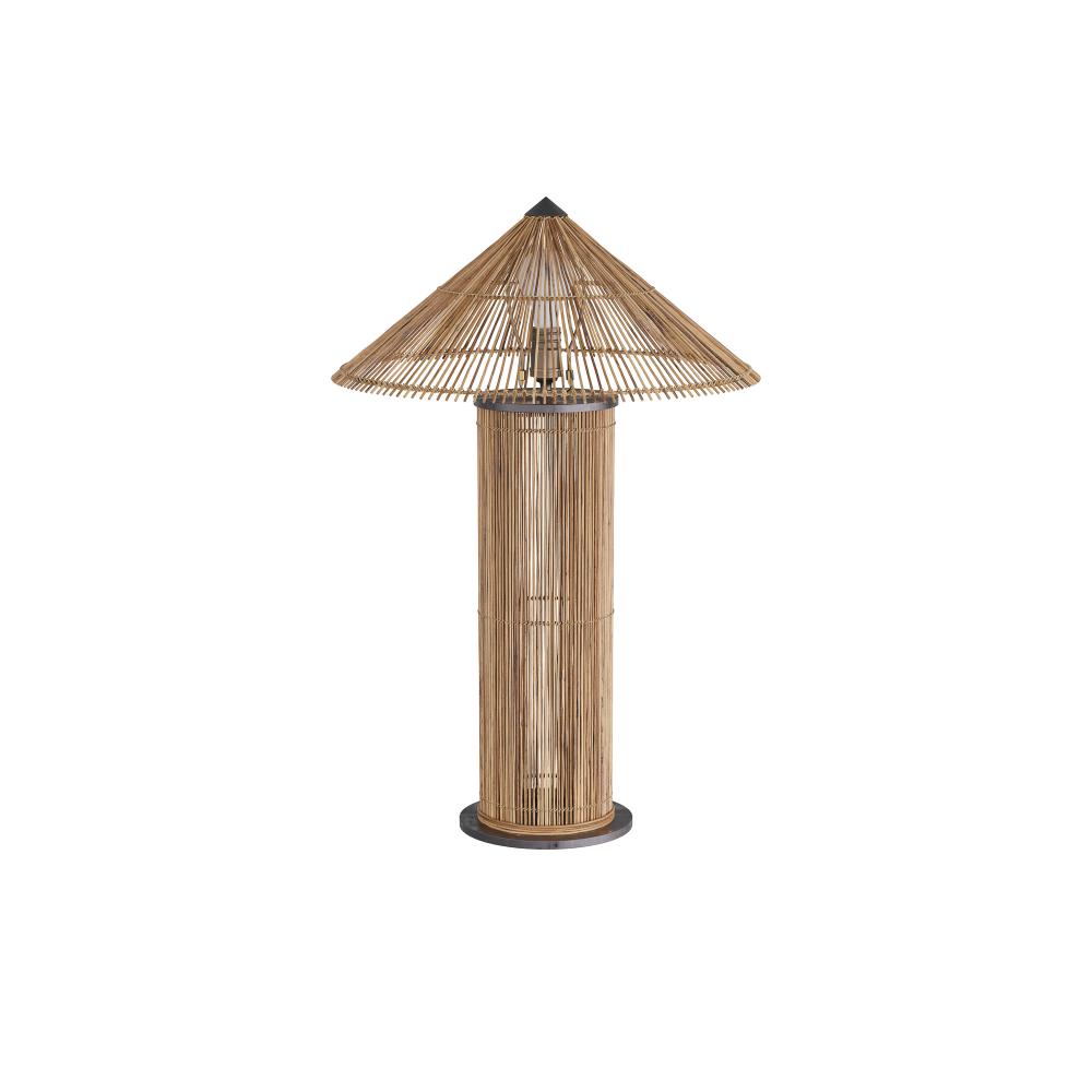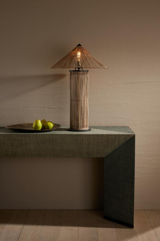 A tapered shade of natural rattan is woven loosely to allow the play of light and shadow across any surface. Complemented by a base of rattan and bronze, the Belize’s classic silhouette allows it to live with a myriad of decorative styles. Capped with a triangular bronze finial. Black cord and on/off rotary switch.