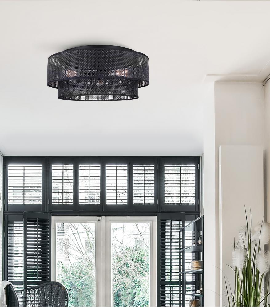 Elegant Design: Introducing BELLAMY, a stylish 3-light flush mount fixture that adds a touch of elegance to any room. Featuring a black rattan shade, BELLAMY exudes sophistication and charm, making it a focal point in your space.