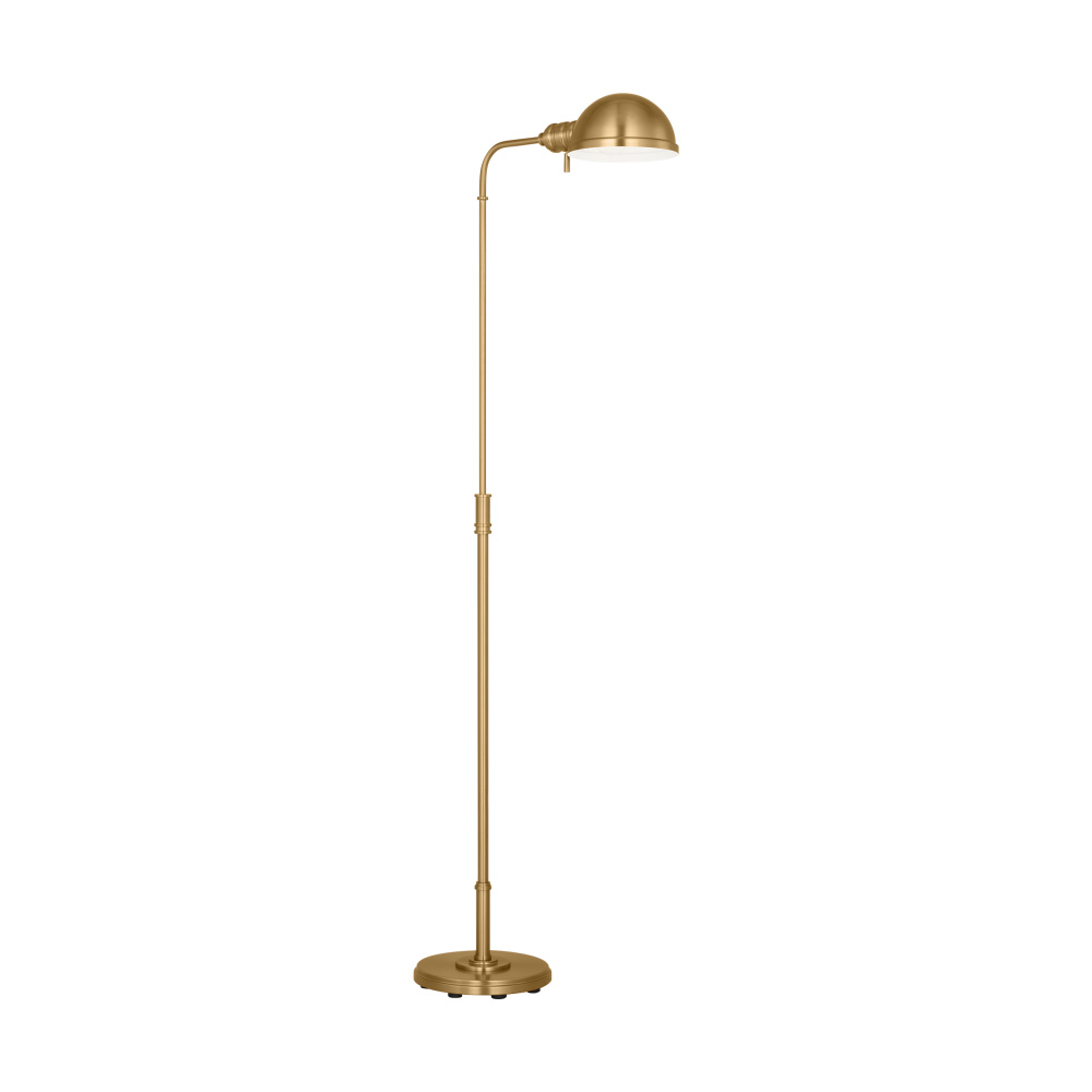 Adjustable height to cast light where desired and features a burnished brass steel shade