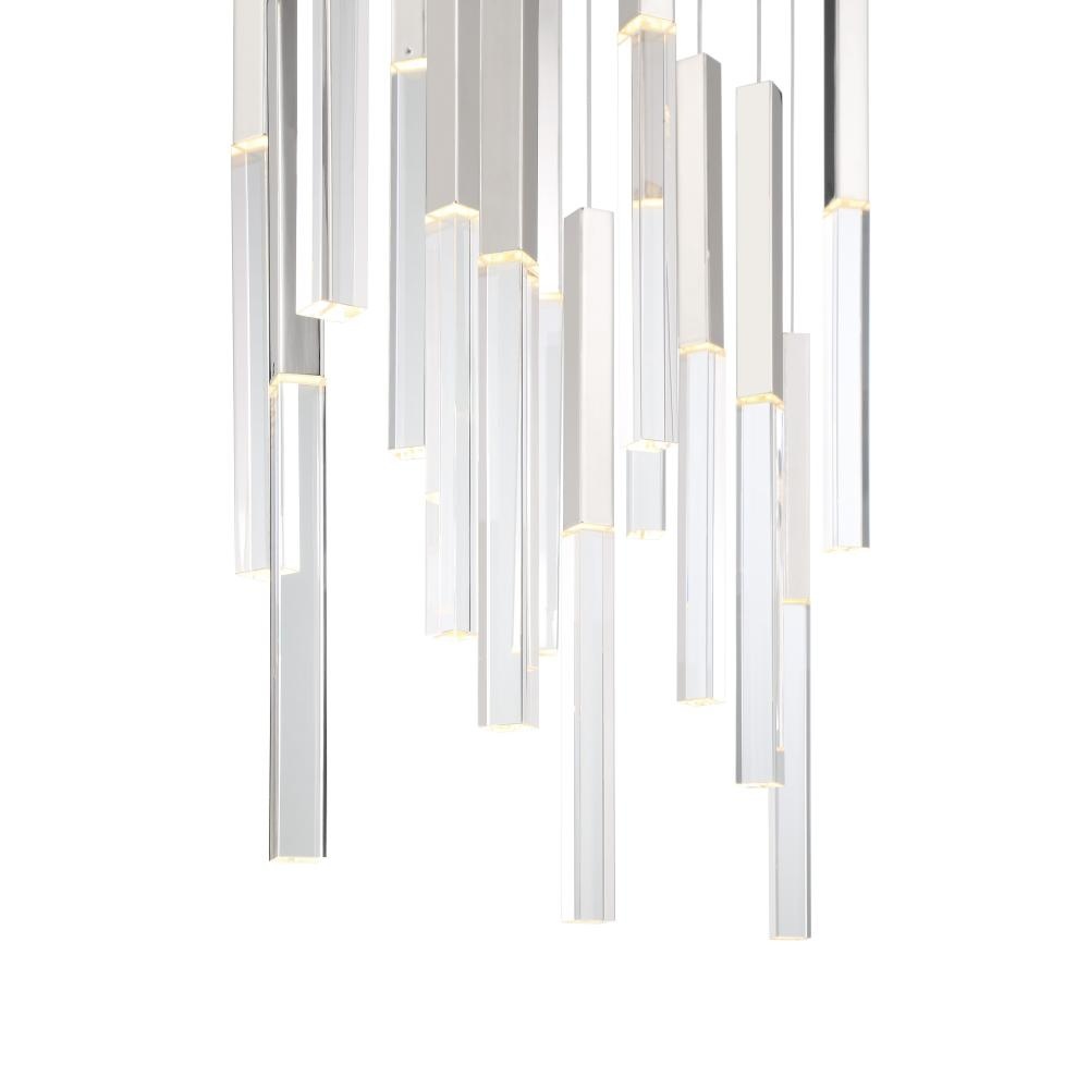 Its crystal rectangular prism and sharp bevelled edges creates a brilliant illumination for the benicio collection. Solid glass vertical spires cast vivid refractions across wall and ceiling surfaces. The thin simple geometric shape lends itself to luxurious and contemporary environments while providing a dual LED light source.