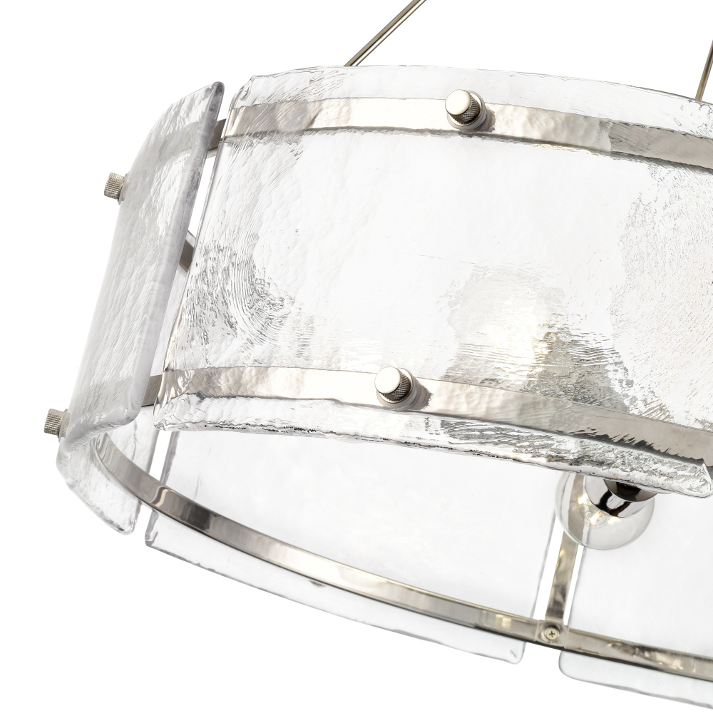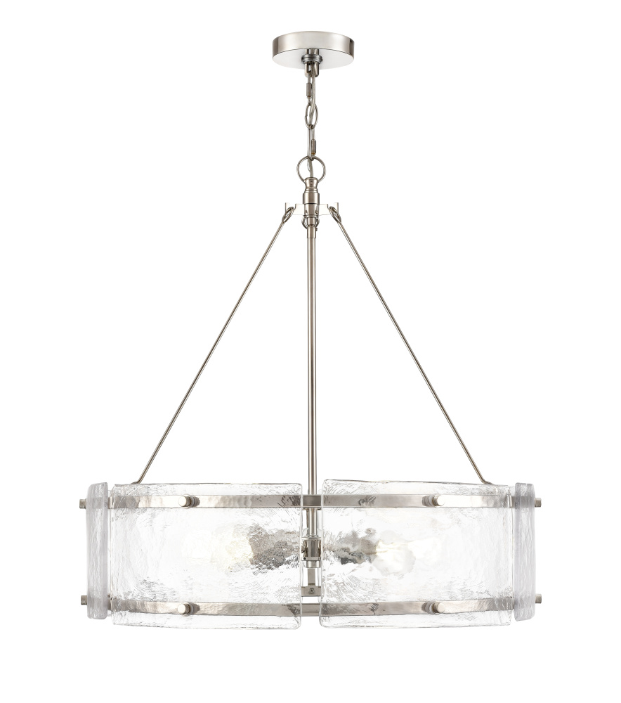 The Bennetti Family of semi-flush mount and chandelier lighting introduces a luxurious design aesthetic into any modern or transitional space. The dynamic lines of the fixtures are punctuated with minimal hardware and are available in either matte black or polished nickel. The understated structure creates the perfect framework for the water glass panels, which provide a sumptuous, dappled lighting effect, perfect for a dining room and foyer.