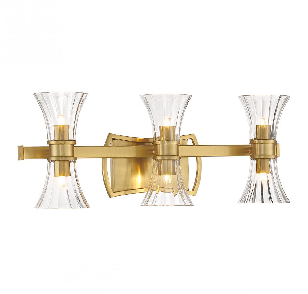 This Savoy House Bennington 6-light bath vanity light features pleasantly curving shapes that combine to create an intriguing lighting look. Fluted clear glass shades and thoughtful detailing on the structure, finished in warm brass, gives the impression of motion. Bennington is 8.75" in height, 24" in width and extends 6" from the wall. G9 LED bulbs are included.