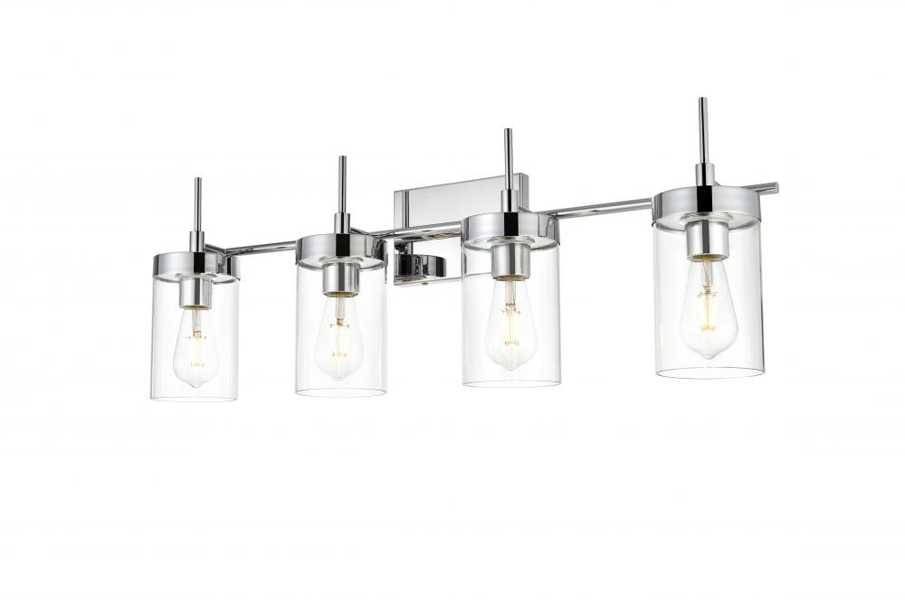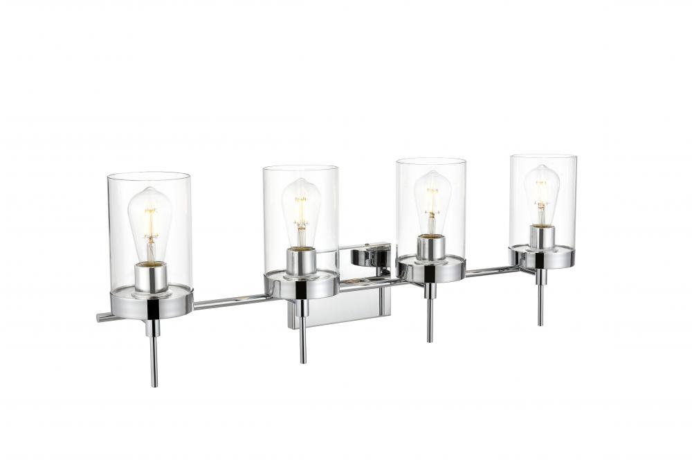 Defined by curved metal arm extends to suspend the clear bell glass shade. A contemporary stunner, it shows off the straight line details from the backplate and the streamline thin metal arm. Compatible with dimmers, so you'll have the right amount of light in any given time of the day. Completely versatile, you can place this wall light as an uplight or downlight. Rated for use in damp locations, this will work perfectly over a vanity in your bathroom.