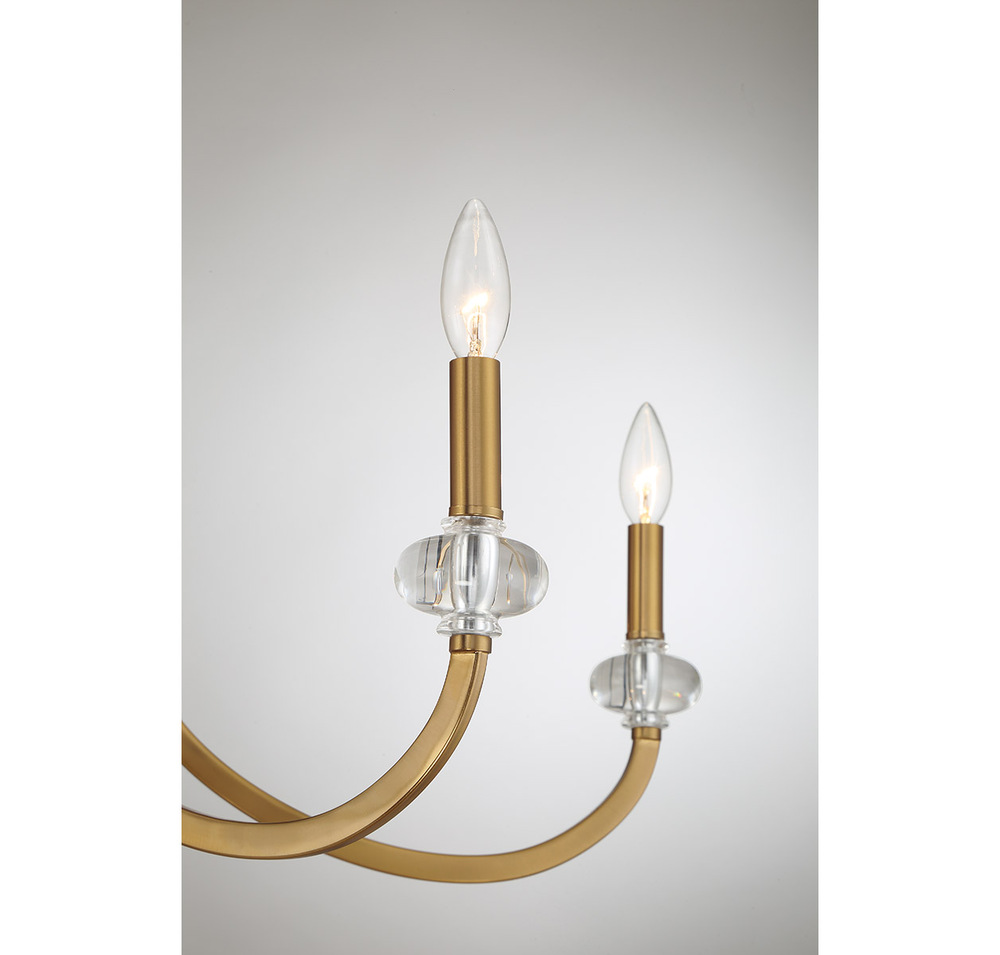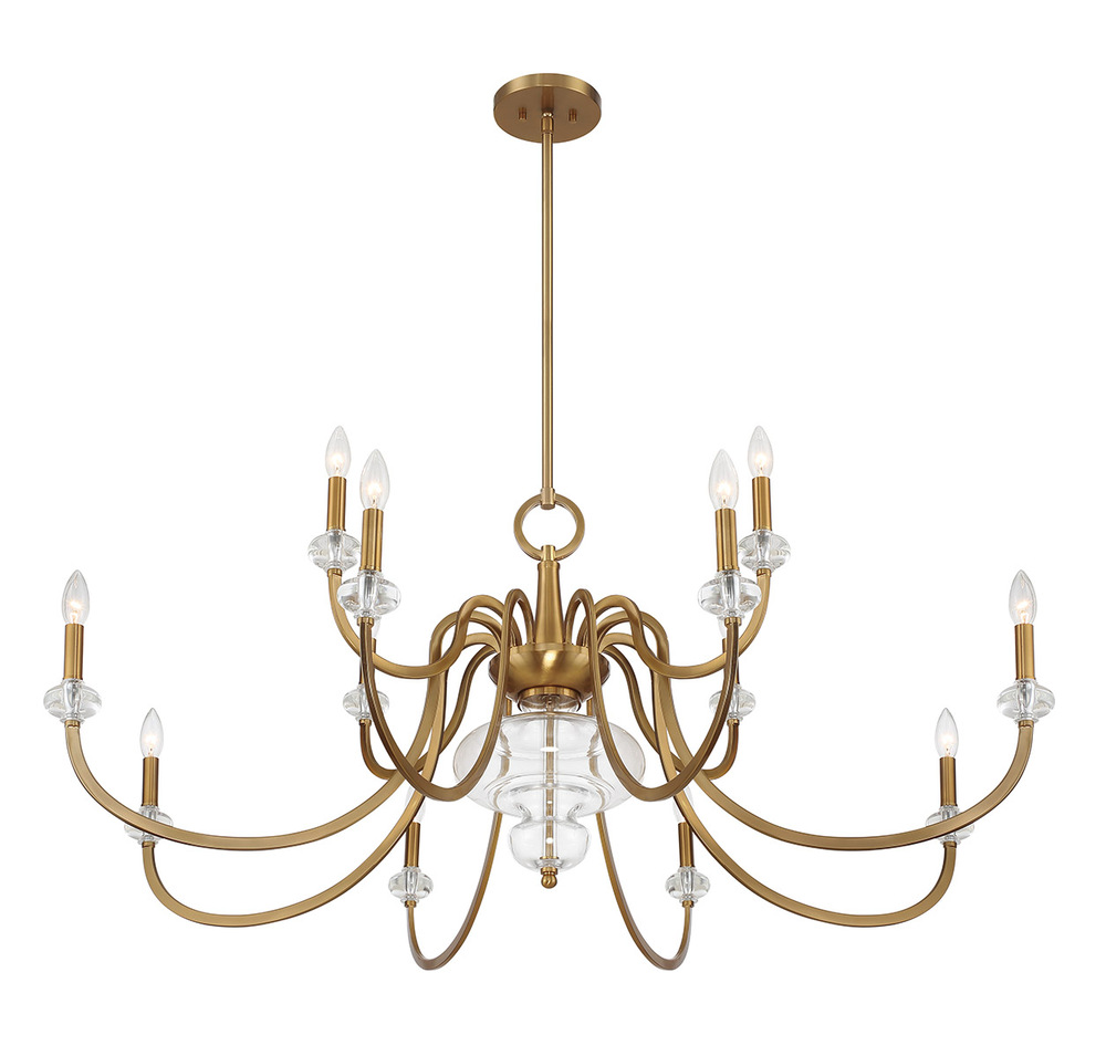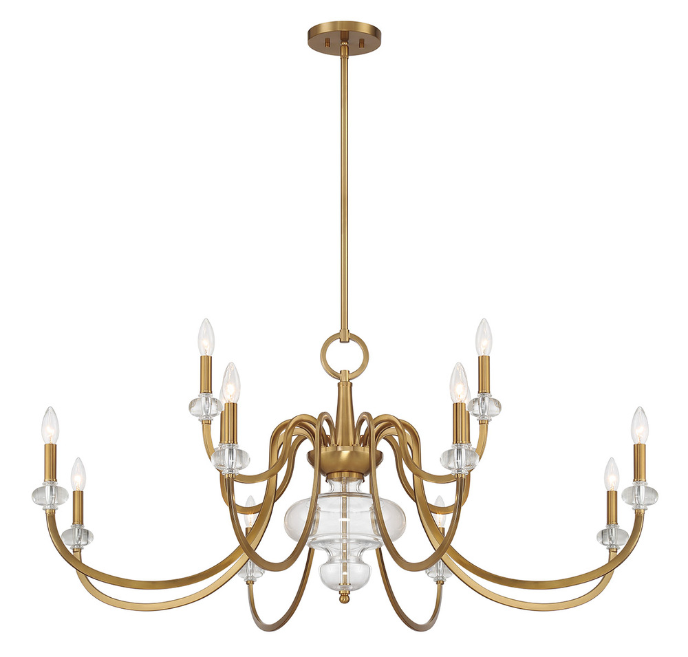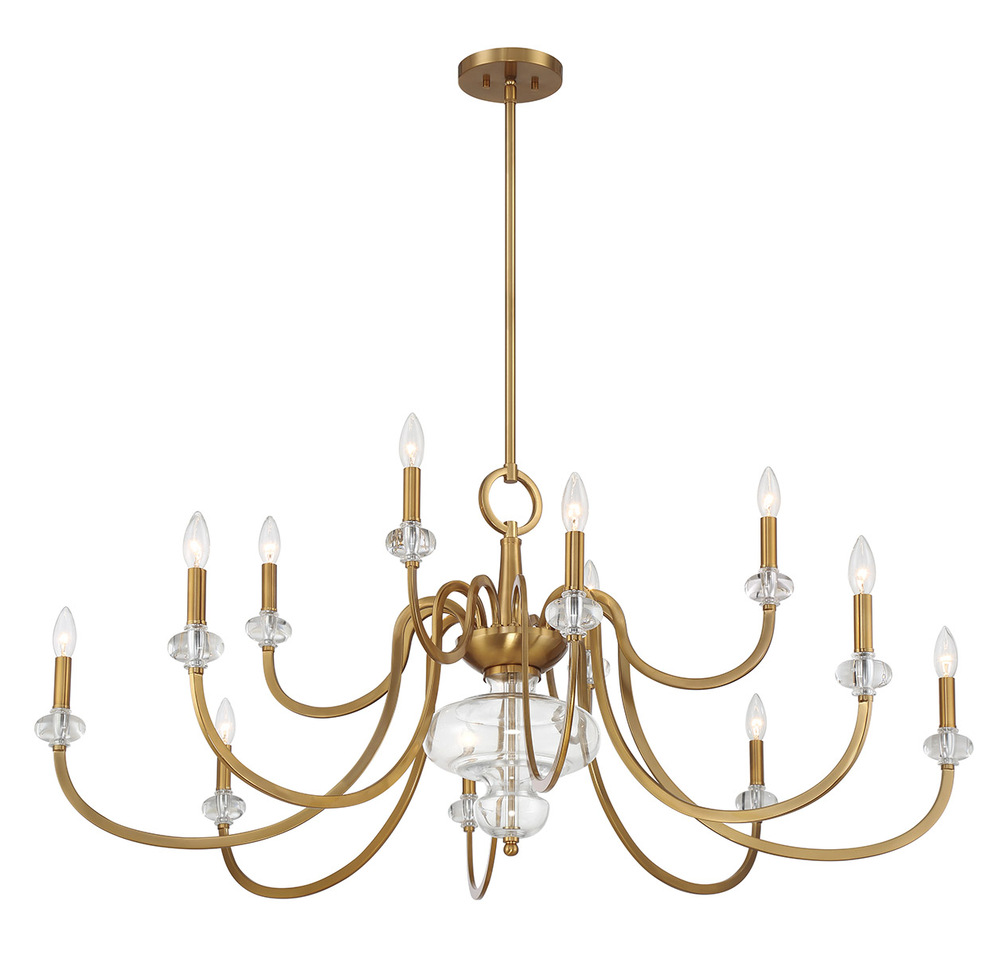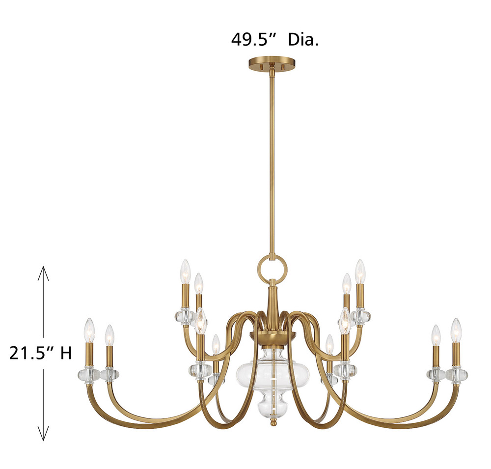 The Savoy House Bergdorf 12-light chandelier is a beautiful way to impart any room with New Traditional style. Dramatically curving arms are finished in Warm Brass and decorated with glass bobeches that match the beautifully molded clear glass detail on the center column. Bergdorf is 49.5" in width and has an adjustable height ranging from 21.5" to 75.5". Comes with four 12" downrods and one 6" downrod. Uses twelve candelabra size bulbs of up to 60 watts per bulb. Bulbs not included.