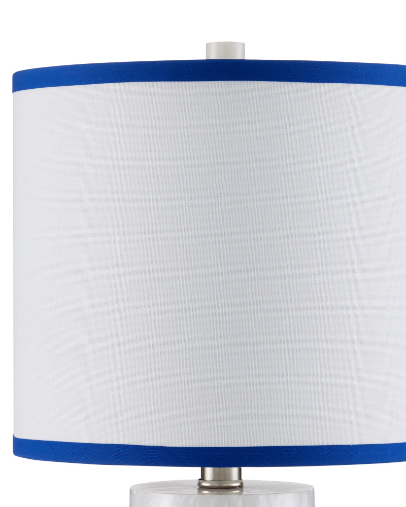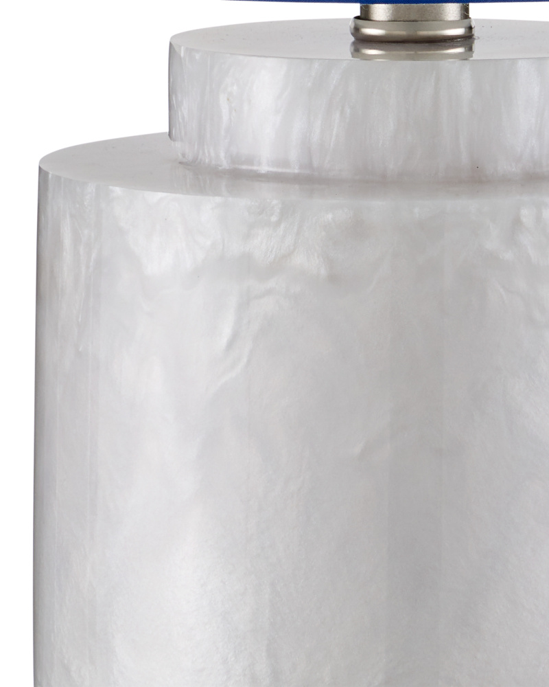 The Beryl White Table Lamp has a luminous geometric body made of composite with a swirling white pattern throughout its composition. The shape is reminiscent of a 1940s design, which brings it a vintage feel, as does the shade trimmed in a matching green.