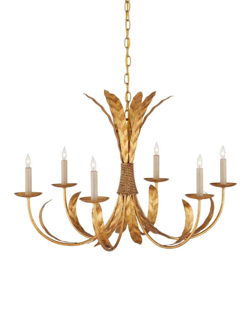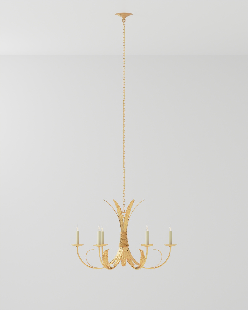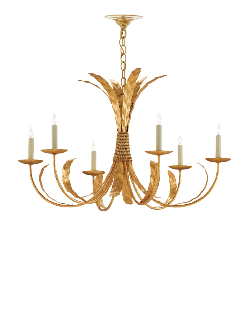 Whether you see a clutch of feathers or a sheaf of fronds, the bundle of finery flowing along the Bette Chandelier brings the fixture panache. The brilliance of the Grecian gold leaf finish transforms the wrought iron framework of this six-light chandelier into a glamorous accoutrement for a luxuriantly designed space. It is one of the beautiful pieces in our Bunny Williams Collection.