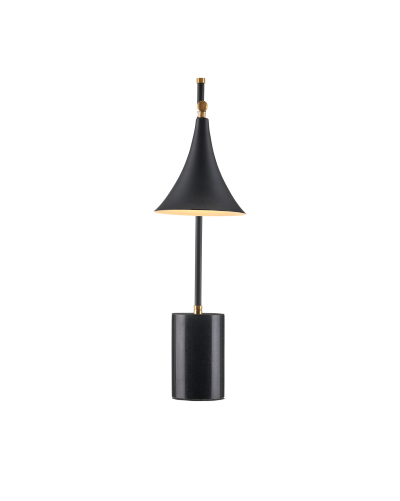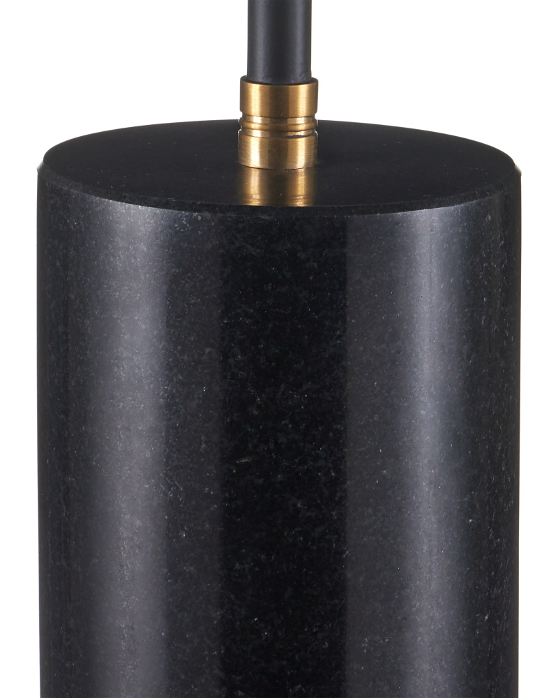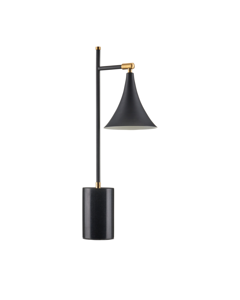 The Bibliophile Table Lamp earns its name with its elegant fluted shade that will cast down-light on the task being undertaken. The thin stem, which rises from a tall cylindrical black marble base, and the shade are in a matte black finish with sophisticated matte brass accents. Though this is a perfect helpmate for a desk, the black table lamp is not adjustable.